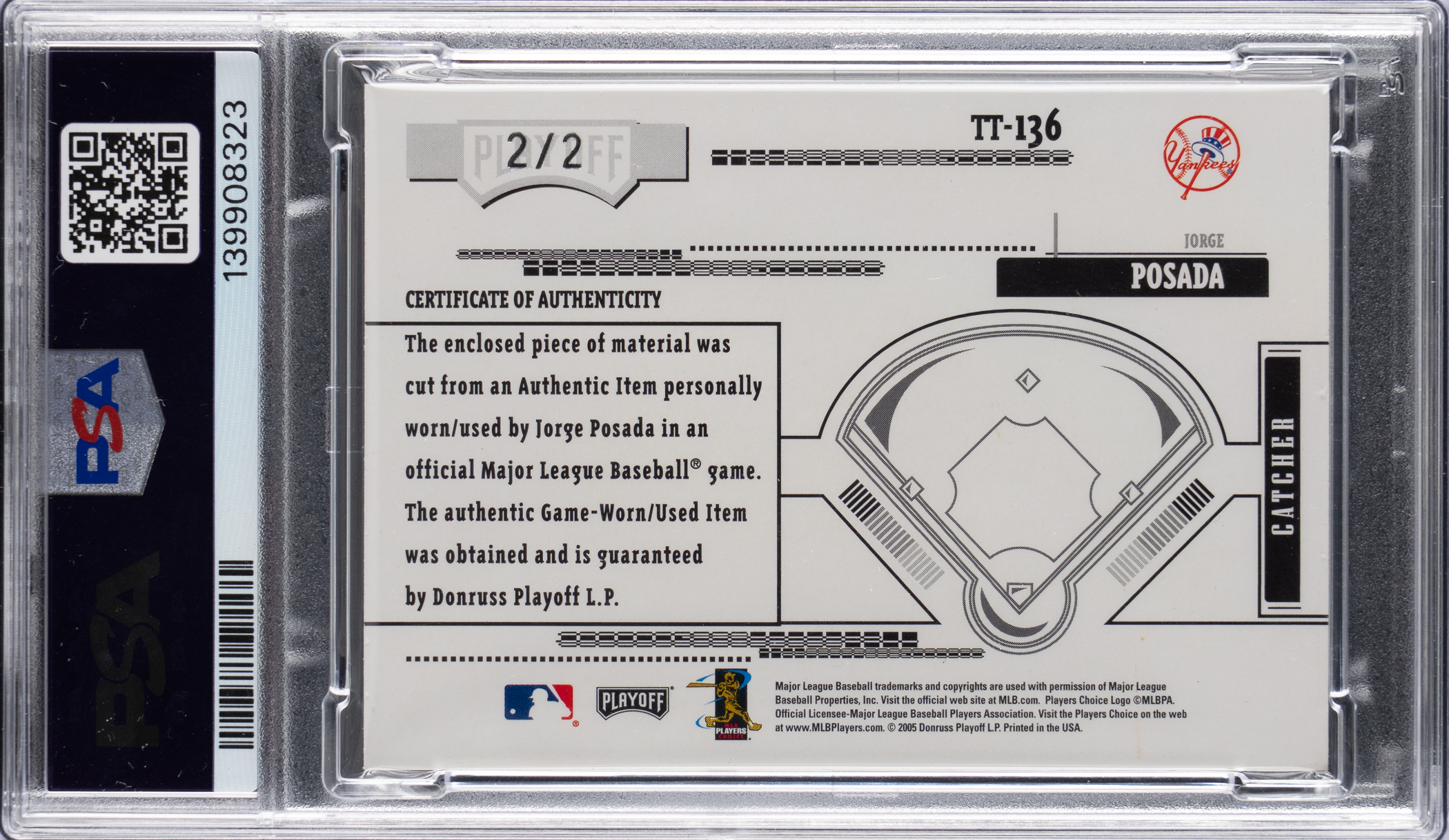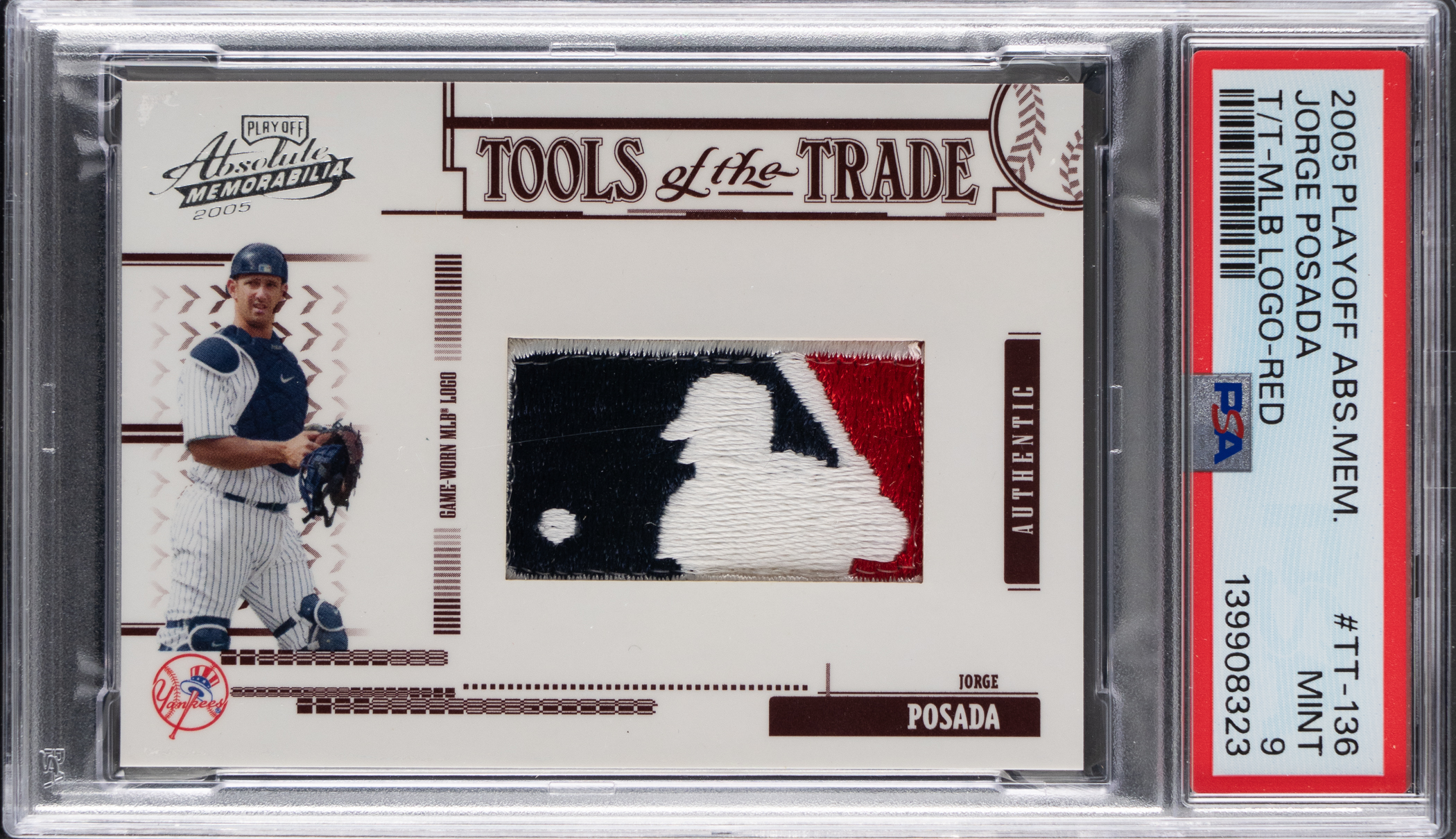 Serially numbered #2/2. Graded MINT 9 by PSA. Clutch New York Yankees postseason performer Jorge Posada delivers big-time with the offered 2005 Playoff Absolute Memorabilia #136 Tools of the Trade logoman patch. With millions of Yankees fans the world over, who will be the lucky victor of this unique piece?!
