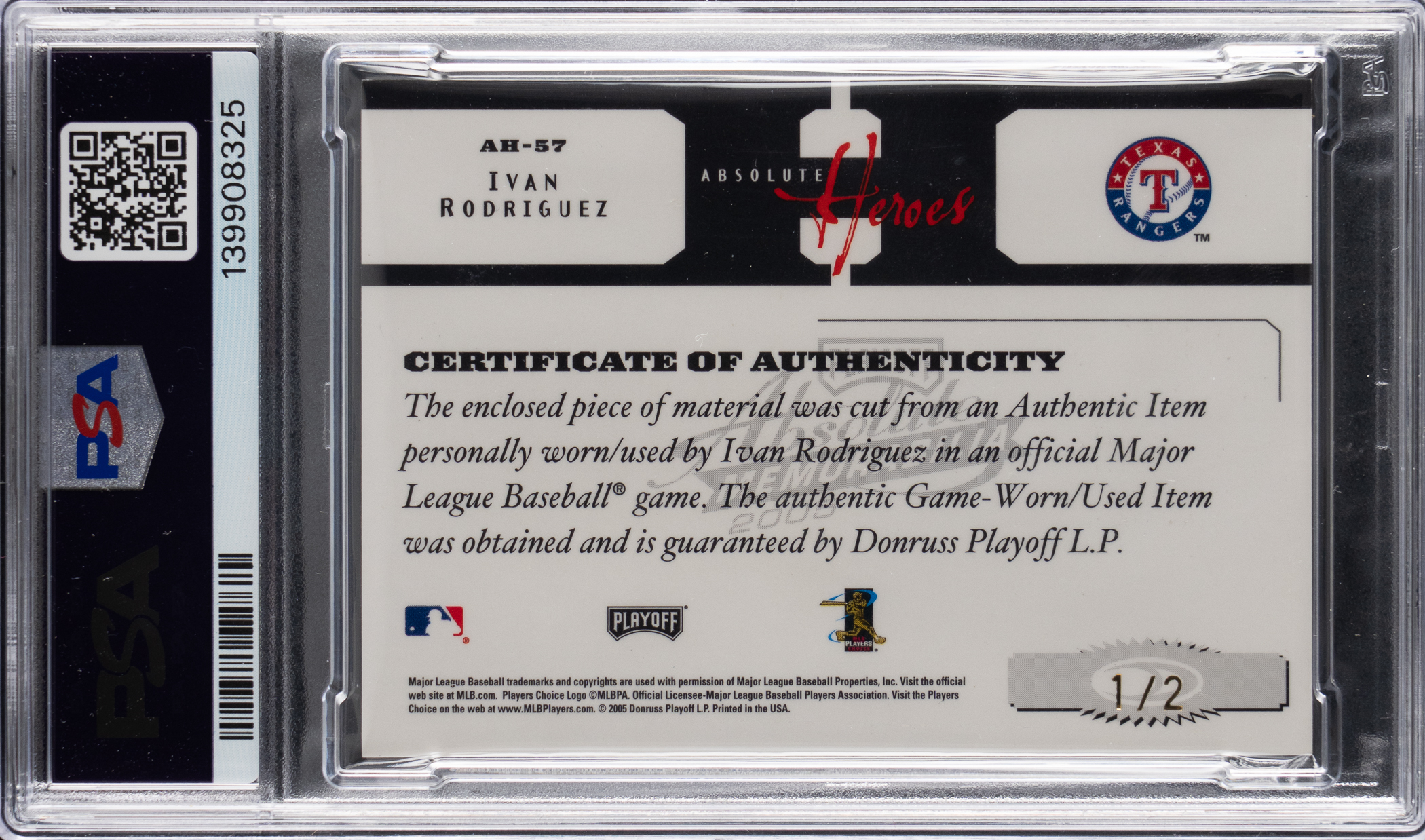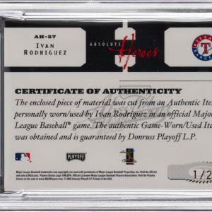 Serially numbered #1/2. Graded NM-MT 8 by PSA. The immortal "Pudge" is the royal subject of the offered 2005 Playoff Absolute Memorabilia #57 Heroes logoman patch. This artifact of the Texas Rangers Hall of Fame backstop is befitting prominent placement in any advanced modern insert collection!