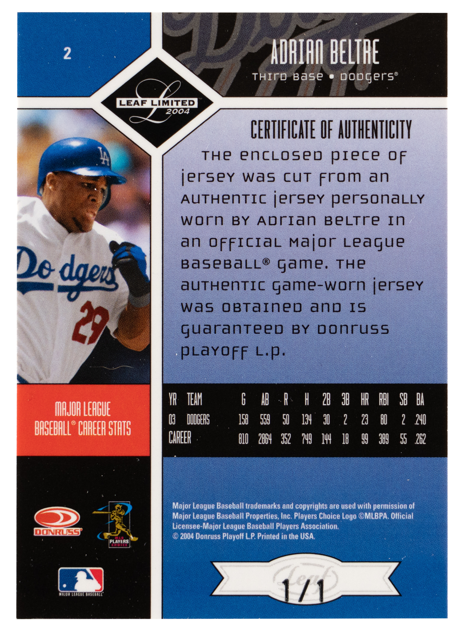 Serially numbered #1/1. With 3,100+ career hits and five gold gloves, Texas Rangers third baseman Adrian Beltre was "a cinch" to be elected into the Hall of Fame. The slugger gets the nod yet again with the offered 2004 Leaf Limited Threads #2 logoman patch. Such unique Cooperstown material is poised to surge in value!