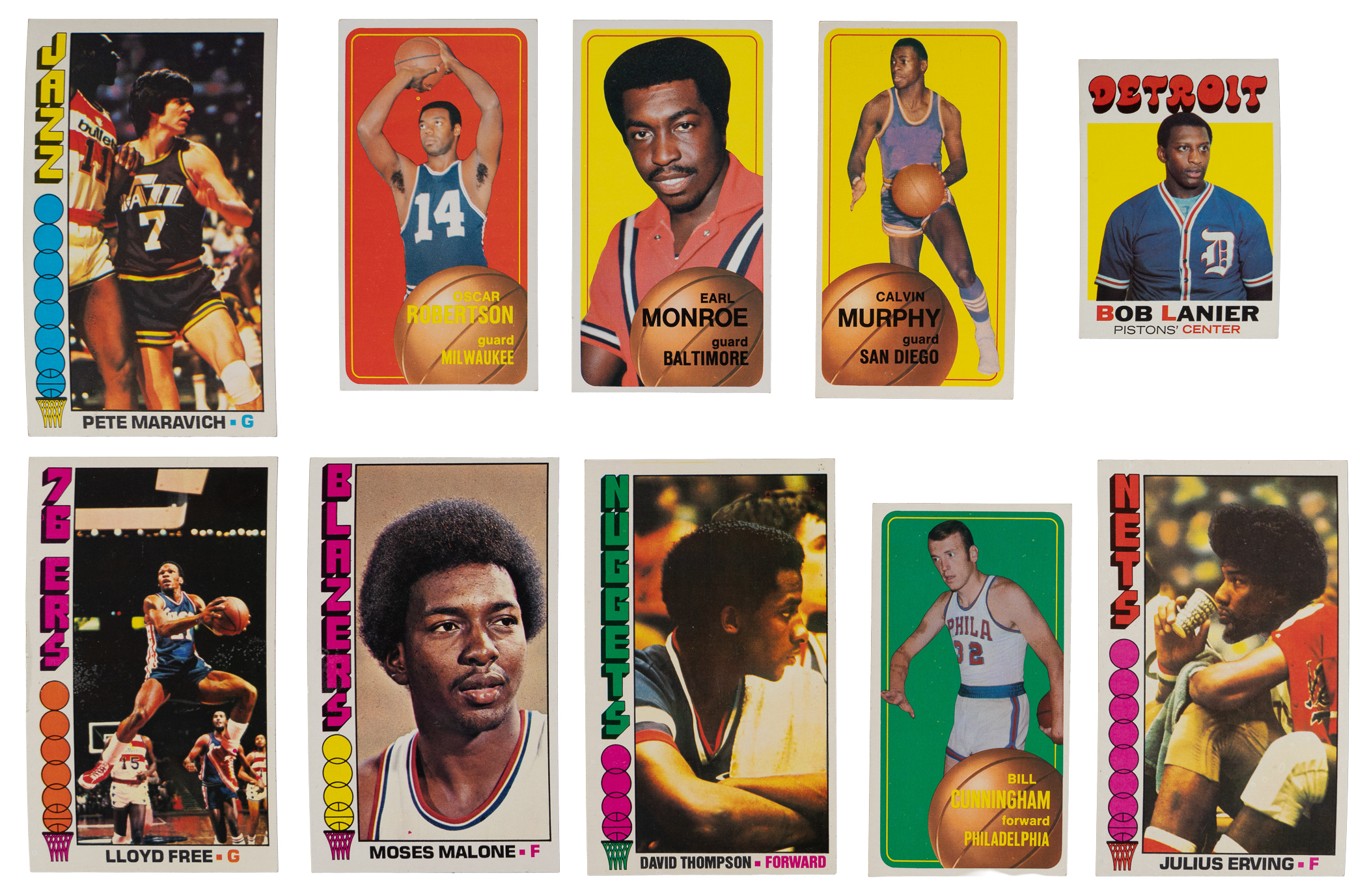 1976-1977 Topps: (5 stars) with #1 Erving (EX-MT), #60 Maravich (EX-MT), #101 M. Malone (EX), #110 D. Thompson RC (EX), #143 Free RC (EX-MT);