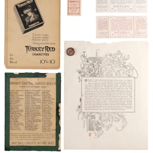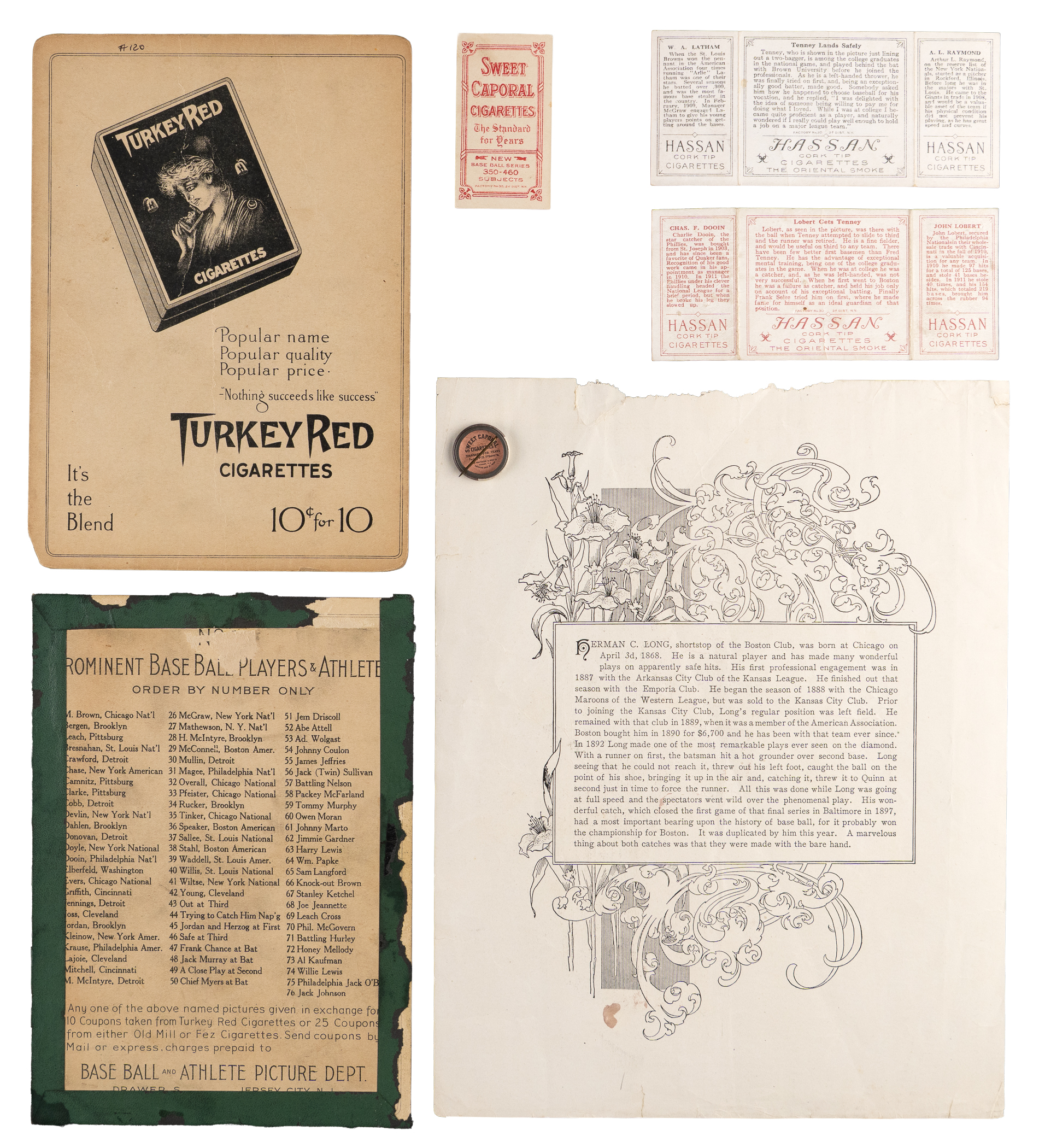 From the family estate of a pre-war big leaguer arrives this interesting 1900-1912 collection of seven different items. Includes: 1900 M101-1 Sporting News Premiums: 9/15/00 Long (PR, missing piece along upper edge); 1909-1911 T206 White Borders: Bridwell (EX, Portrait, with Cap, Sweet Caporal back); 1910-1912 P2 Sweet Caporal Pins: Mattern (EX-MT, Small Letters); 1911 T3 Turkey Red Cabinets: (2 cabinets) with #33 Pfeister (PR, reverse tape residue, checklist back), #120 Street (PR, reverse writing, ad back); 1912 T202 Hassan Triple Folders: (2 cards) with Lobert/Lobert Gets Tenney/Dooin (GD), Raymond/Tenney Lands Safely/Latham (EX);
