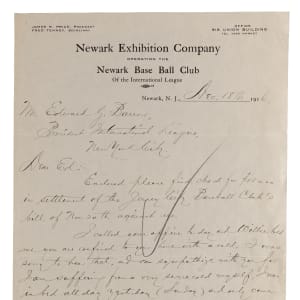 This is a historic letter with fantastic baseball content. The letter is on “Newark Exhibition Company Operating the Newark Base Ball Club of the International League” stationery, James R. Price, President - Fred Tenney, Secretary - Office Big Union Building, Newark, NJ, dated December 18th, 1916, to Mr. Edward G. Barrow President International League - New York City.