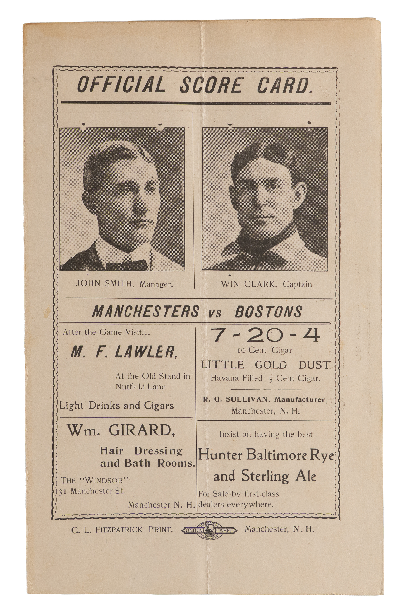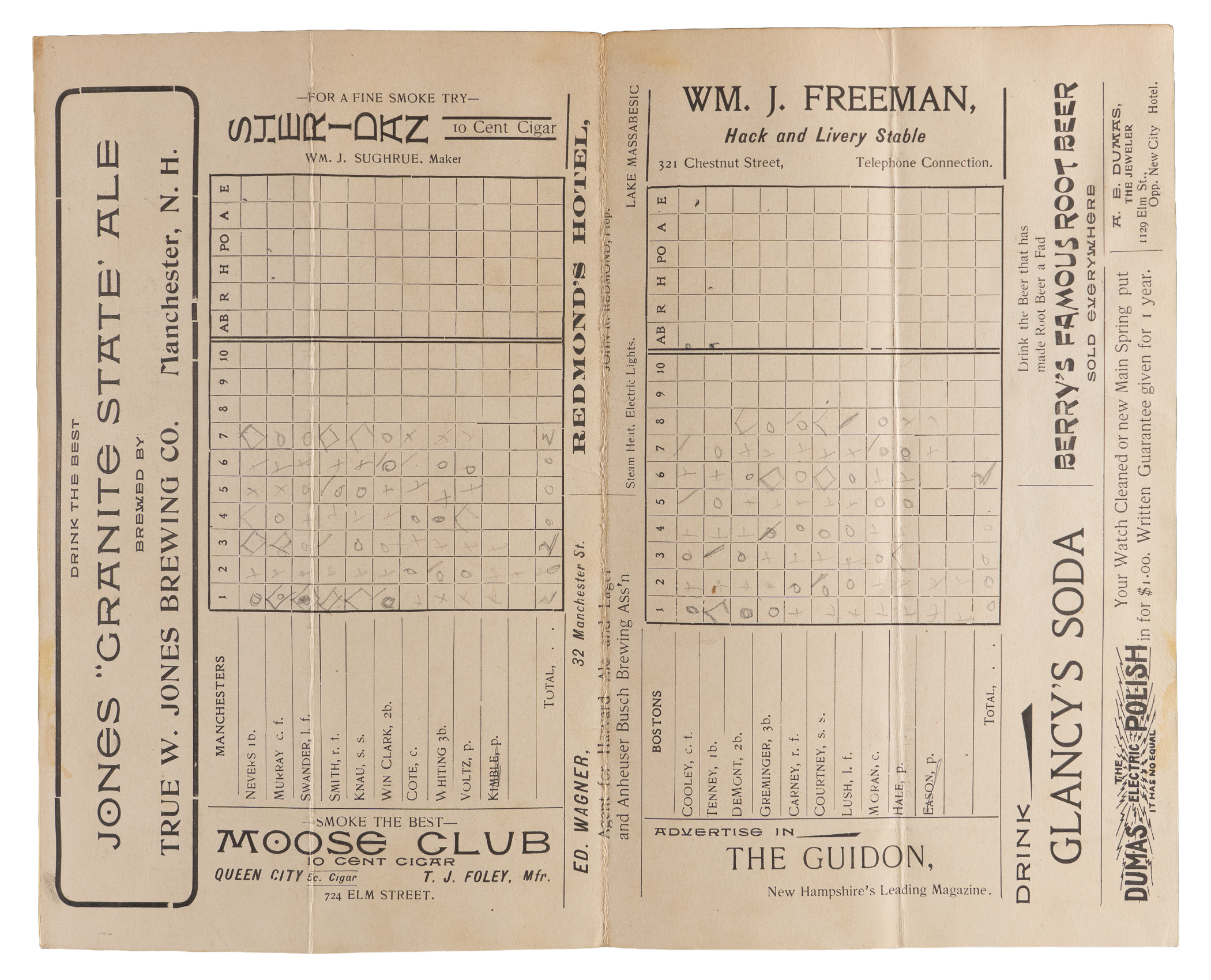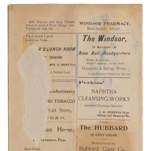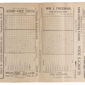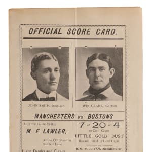 Interesting barnstorming scorecard from a 1902 exhibition between the Boston Beanteaters and the "Manchesters". The club from New Hampshire would finish 1st in the New England League this season, managed by Phenomenal Smith. Per Wikipedia, Smith is "credited with discovering Christy Mathewson in 1899 and developing him into an outstanding pitcher during the 1900 season". Pictured on the front alongside team captain Win Clark, the cover remains very attractive despite a moderate, yet non-intrusive, vertical crease which penetrates the entirety of the fold out scorecard. The interior has been neatly scored, featuring notable Boston stalwarts such as Duff Cooley, Ed Gremminger (mis-spelled) and Fred Tenney. Despite some discoloration and surface loss on the back cover, this nearly 125 year old relic will be a welcomed addition to any New England-centric collection.