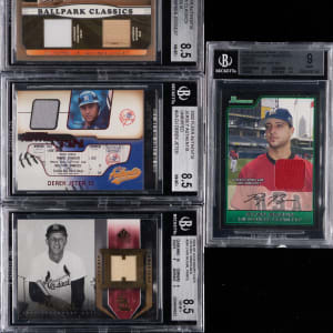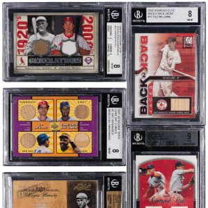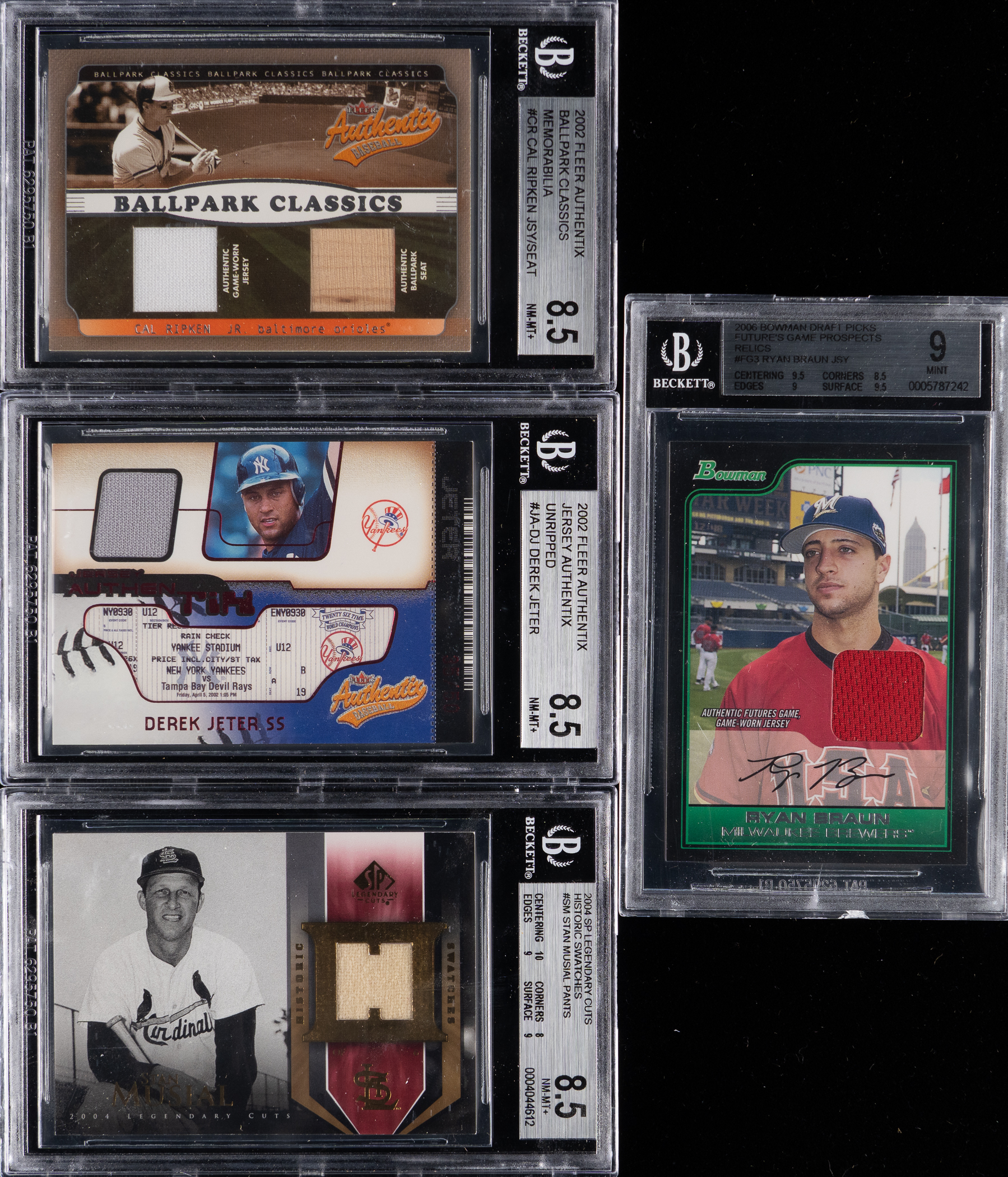 Each graded by BGS. Hard-hitting lineup of (9) 2001-2008 Hall of Fame and star multi/single game-used relic cards. Several of these modern inserts are numbered and come from various tiered subsets. Includes: BGS GEM MINT 9.5: 2004 Playoff Prime Cuts Hornsby bat (#/125); BGS MINT 9: (2 cards) with 2005 Flair Diamond Cuts Pujols/Rolen dual jersey; 2006 Bowman Draft Picks Braun RC relics; BGS NM-MT+ 8.5: (3 cards) with 2002 Fleer Authentic: (2 cards) with Jeter jersey, Ripken Jr. jersey/seat; 2004 SP Legendary Cuts Musial pants; BGS NM-MT 8: (3 cards) with 2001 Upper Deck Decades 1970’s Game Bat Combos K. Hernandez/Madlock/Lynn/Parker, 2002 Donruss Elite #15 T. Williams bat #/100) and 2008 SP Legendary Cuts Hornsby/Utley dual jersey.