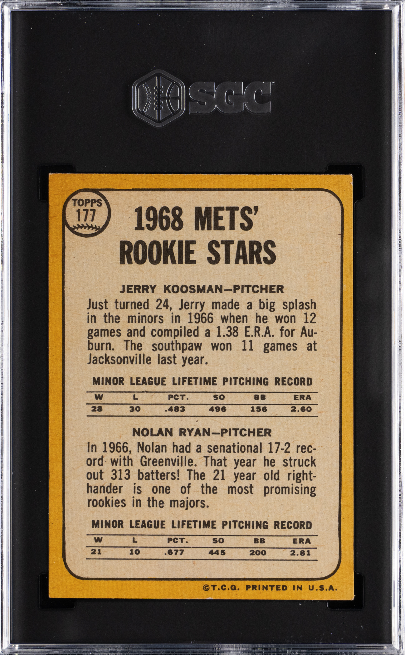 Graded VG/EX+ 4.5 by SGC. The pride of Alvin, Texas, makes his cardboard debut on the offered 1968 Topps #177 Nolan Ryan rookie card. This New York Mets Hall of Fame dynamo is quite clean with a crease-free foundation and striking surface colors.