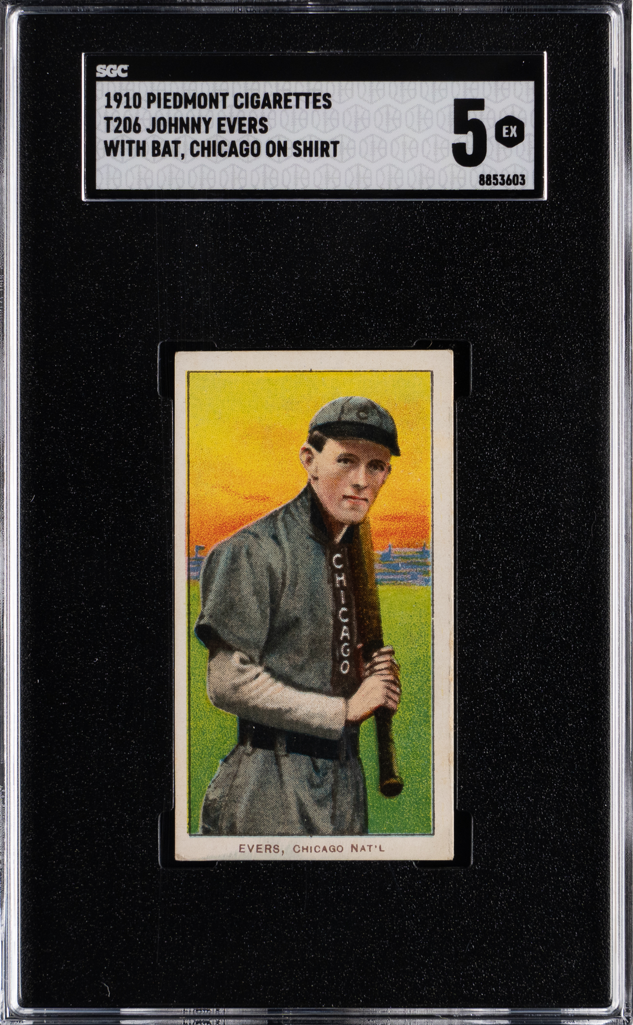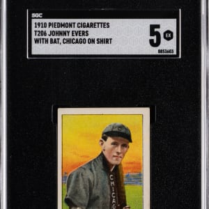Graded EX 5 by SGC. Striking 1909-1911 T206 White Borders Johnny Evers (with Bat, Chicago on Shirt) variation. As one of the most recognizable poses in the prolific edition, this crease-free and vibrant relic will certainly attract significant bidding interest. The decently centered Chicago Cubs Hall of Famer displays a clean Piedmont 350 Subjects back with bold advertising text.