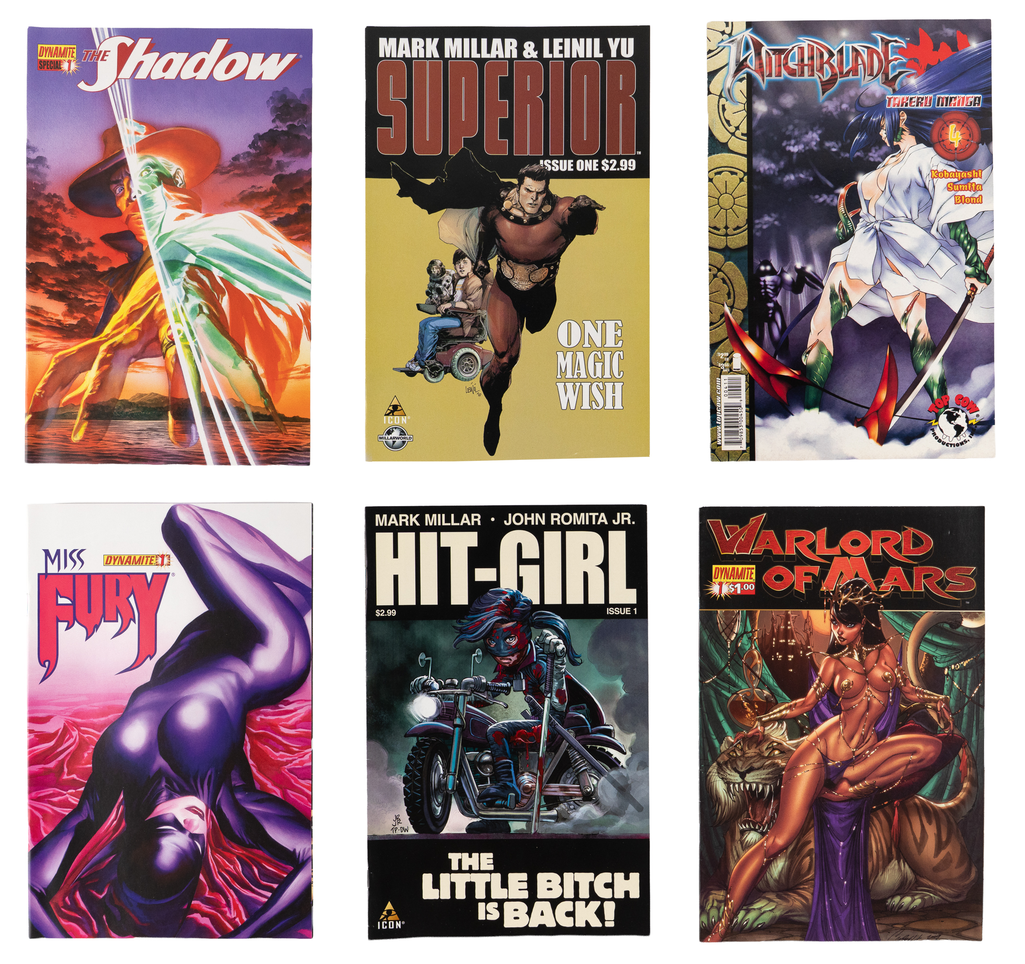 Ex Machina #29 (F), Authority #1 (NM/VF), Hell Mouth #1 (VF/F), Chilling Adventures of Sabrina #1(VF), The Shadow Annual #1 (NM/VF), Red Sonja (2015) #1 (VF/F), Bettie Page #4 (VF/F), Witchblade Manga #4 (VF), Superior #1 (VG/G), The Shadow Special #1 (VF/F), Miss Fury #1 (VF/F), Warlord of Wars #1 (VG/G), Hit-Girl #1 (VF/F), Echo #1 (VF/F)