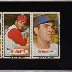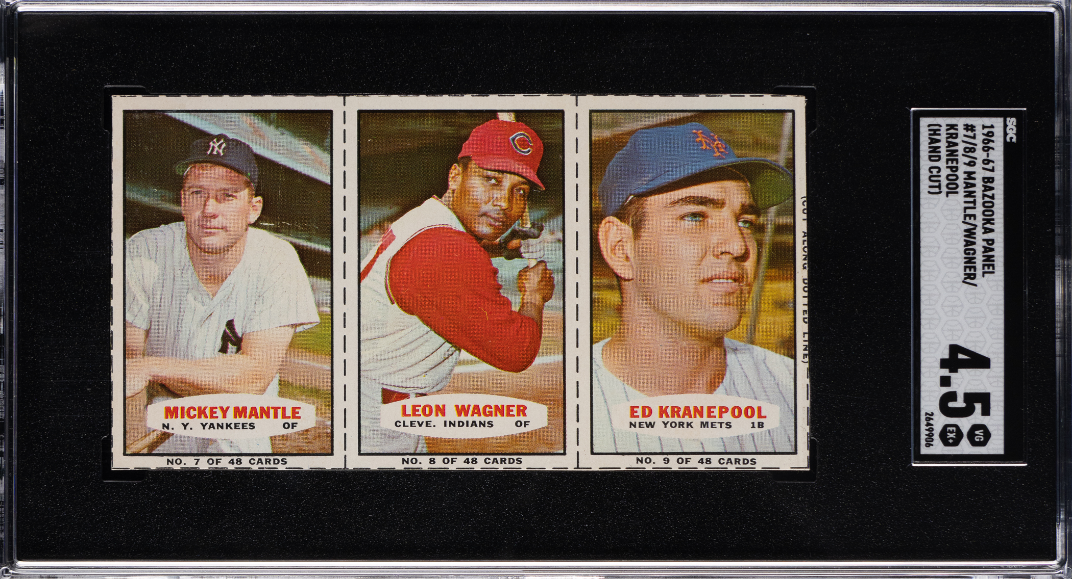 Graded VG/EX+ 4.5 by SGC. Scarce 1966 Bazooka three-card panel picturing #7 Mickey Mantle, #8 Leon Wagner and #9 Ed Kranepool. Very few of these bubble gum box panels have survived in complete, uncut form. With exception to a microscopic surface wrinkle near the upper left corner, the showpiece Mantle remains incredibly attractive with sharp corners, creamy edges and intact guide lines.