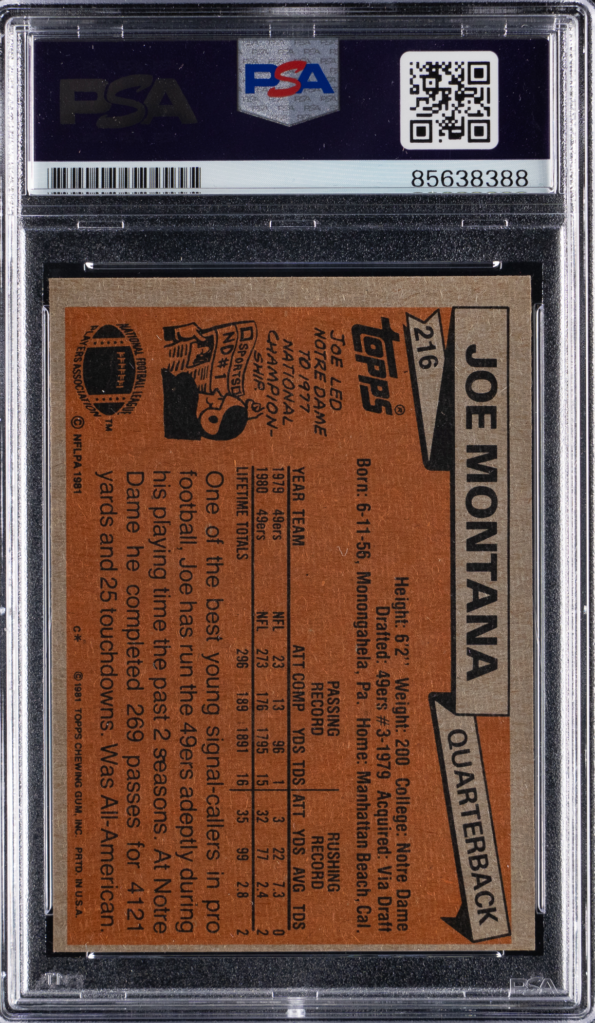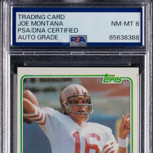 Signature judged Authentic by PSA/DNA and encapsulated with an "8" Auto grade. A beautifully signed 1981 Topps Football #216 Joe Montana rookie card! This acclaimed debut of the San Francisco 49ers Hall of Fame quarterback displays a bold Sharpie signature that is placed on a striking (NM) surface.