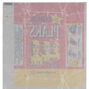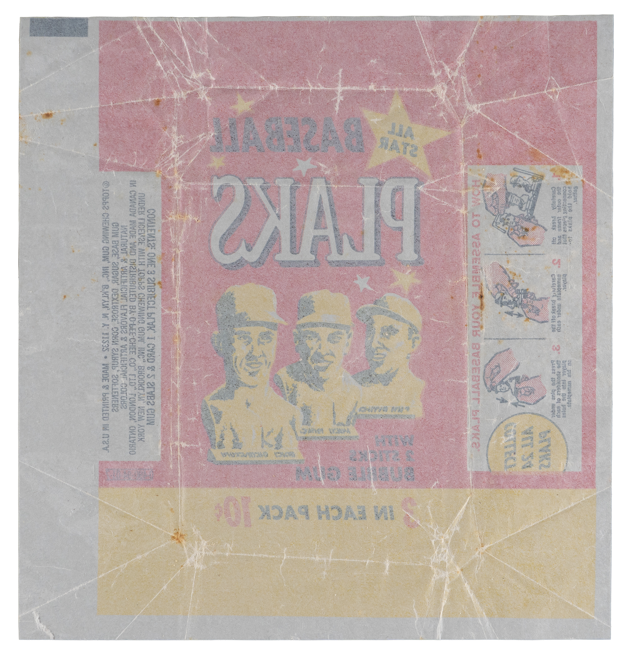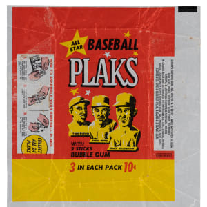 Incredibly difficult 1968 Topps Baseball Plaks wrapper. This neatly unfolded 6-1/4 x 6-1/2 packaging once held a three-player sprue of plastic busts from the test issue and two sticks of bubble gum. Despite limited fold stress, the perimeter is sharp and the waxy foundation showcases exceptionally bold and vibrant surface colors. Add this true rarity to your vintage Topps wrapper portfolio!