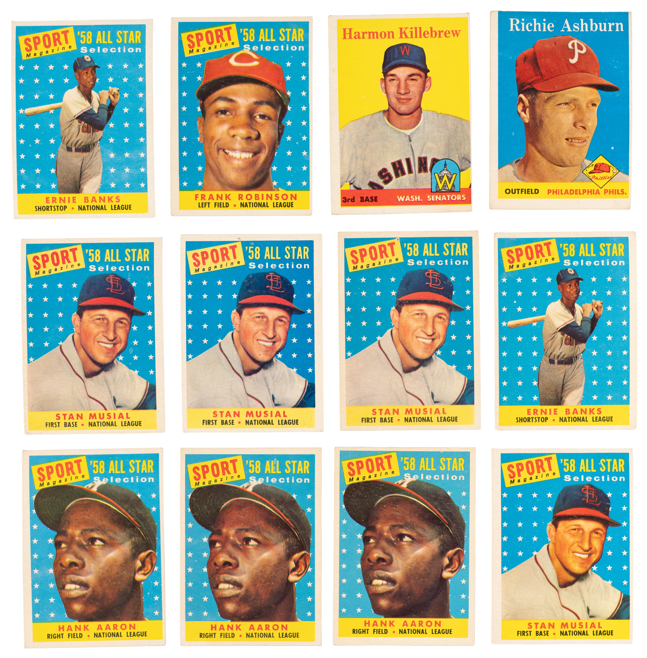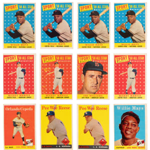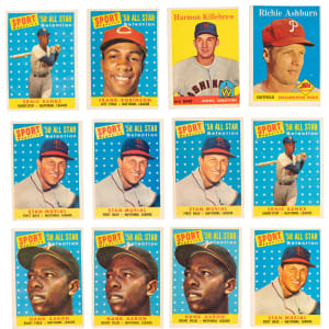 Stacked 1958 Topps collection of (190) cards with (35+) Hall of Famers featuring a “who’s who” of “golden age” legends! This mid-grade parade generally presents in the (VG to VG-EX) range with some better or lesser. Highlights include: #5 Mays (GD), #71 Dodgers Team (FR), #230 Ashburn (VG), #288 Killebrew (GD), #343 Cepeda RC (VG), (2) #375 Reese (VG, GD), (2) #420 Pinson RC (both VG), #464 Flood RC (GD), (4) #476 Musial AS (average VG-EX), (2) #480 Mathews AS (both VG-EX), (2) #482 Banks AS (VG-EX, VG), #484 F. Robinson AS (VG), #485 T. Williams AS (VG-EX), (4) #486 Mays AS (average VG), (3) #487 Mantle AS ((2) VG-EX, VG), (3) #488 Aaron AS ((2) VG-EX, VG) and (2) #494 Spahn AS (VG-EX, VG).