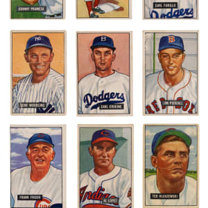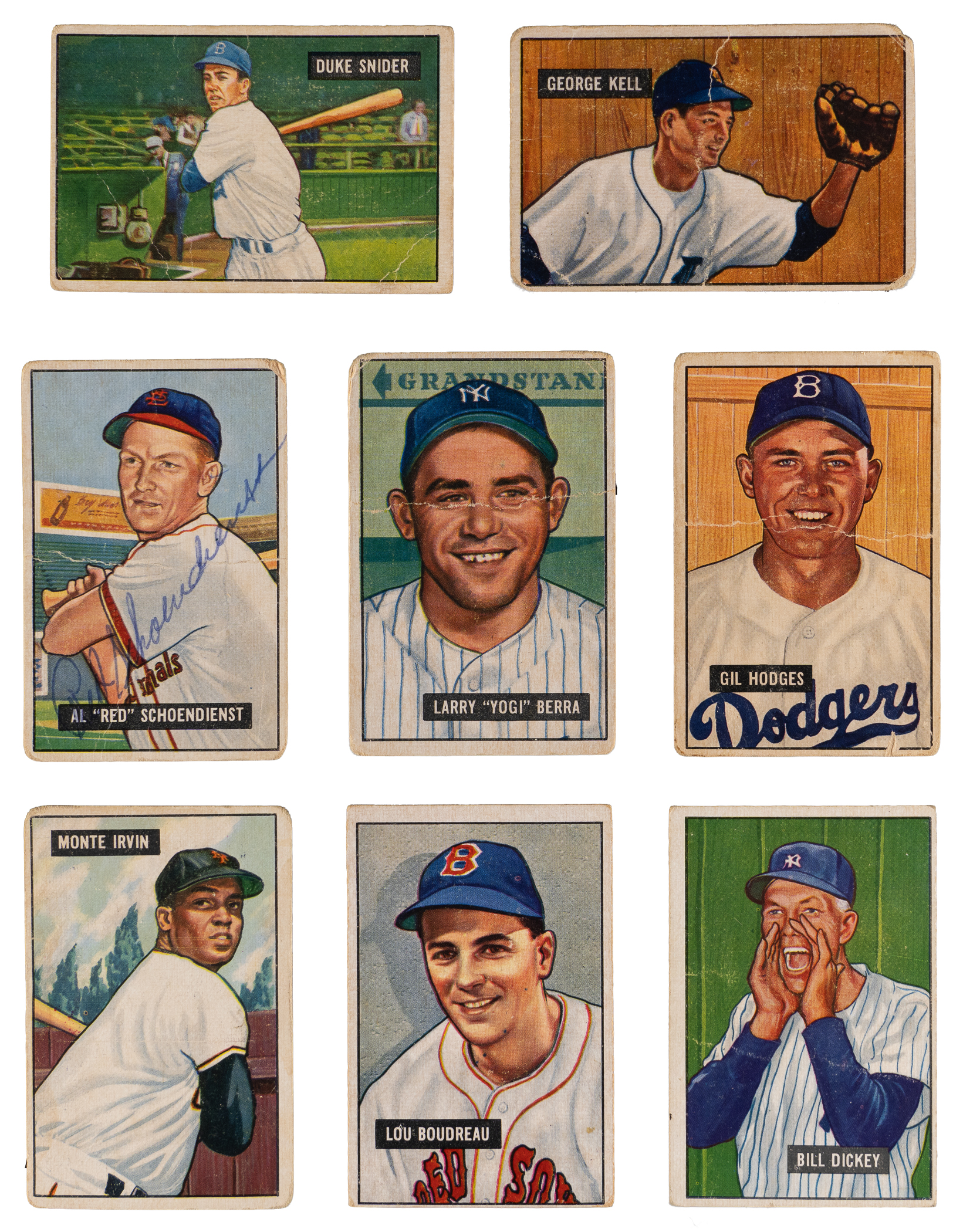 There’s plenty of upgrade potential available with the offered 1951 Bowman near complete set of (274/324) cards with several Hall of Famers and stars. This framework has an approximate condition breakdown of 20% (VG or better), 25% (GD), 35% (FR) and 20% (PR) with nearly 10% displaying reverse writing. The (65) tougher high series cards generally present on level with the more available numbers. Highlights include: #2 Berra (PR), #7 Hodges (PR, reverse writing), signed #10 Schoendienst (PR, Auto “8”, Auction LOA from James Spence/JSA), #32 Snider (FR), #46 Kell (PR), #62 Boudreau (VG), #81 Furillo (VG), #143 Kluszewski (PR), #198 Irvin RC (FR), #219 Woodling RC (PR), #260 Erskine RC (FR, reverse writing), #282 Frisch (PR, reverse paper loss), #290 Dickey (FR), #295 Lopez (VG), #306 Piersall RC (FR, residue), #323 Adcock RC (VG) and #324 Pramesa RC (VG).