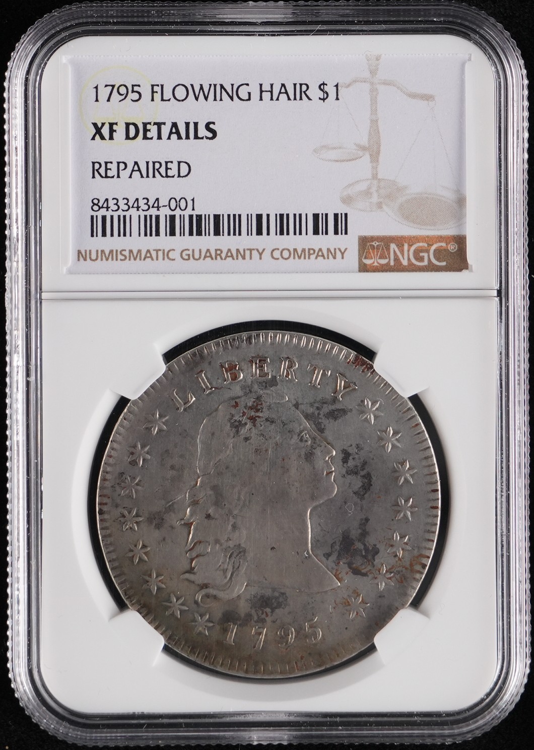 Coin aficionados track down some big game, by taking up the hunt for this 1795 U.S. Flowing Hair silver dollar. Regarded as a great prize by modern day collectors, the Flowing Hair dollar was the first $1 coin type issued by the United States federal government. This ancient type was produced for just two years, in 1794 and 1795. Offered here is a coin identified as an example of the “3 Leaves” variety of the 1795 Flowing Hair dollar. The original mintage quantity is reported as 160,295, and the surviving population is estimated at 6,000 pieces, in all grades. NGC has encapsulated this scarce dollar with an XF Details, Repaired designation.