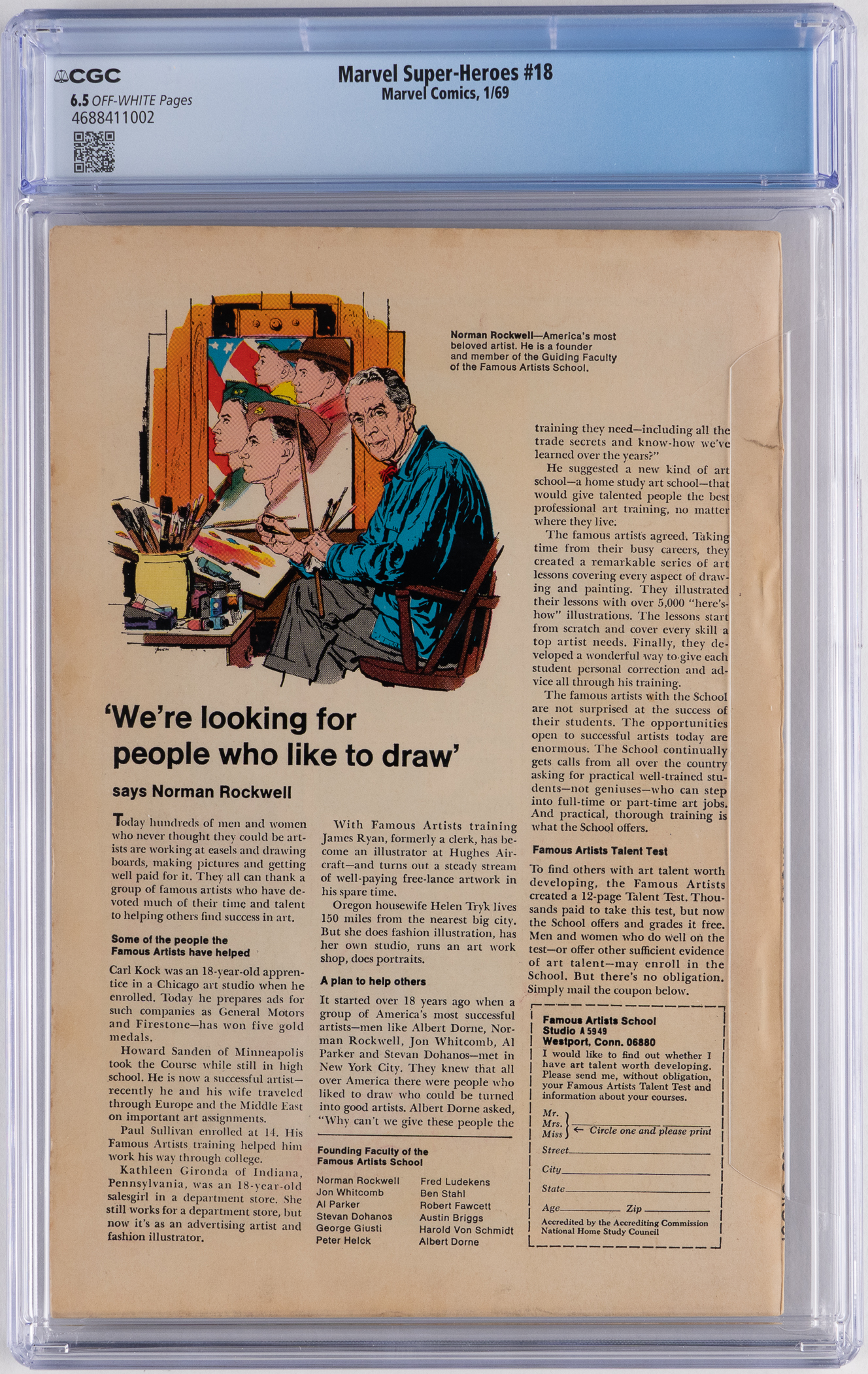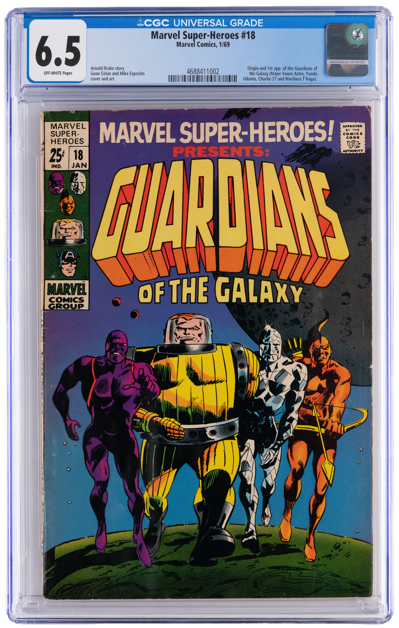 Head back to ground zero for Marvel’s mighty interstellar team The Guardians of the Galaxy, with the examination of this 1/69 Marvel Super-Heroes #18 issue. This anthology title was published with a mix of new and reprinted tales. In the case of this #18 issue, the seminal GOTG feature was a new story, counting as the team’s first appearance. The lineup was comprised with space-faring heroes Major Vance Astro, Yondu Udonta, Charlie-27 and Martinex T'Naga. CGC has encapsulated this early Bronze Age key with a grade of 6.5, Off-White Pages. Label notes are “Arnold Drake story, Gene Colan and Mike Esposito cover and art. Origin and 1st app. of the Guardians of the Galaxy (Major Vance Astro, Yondu Udonta, Charlie-27 and Martinex T'Naga).”.