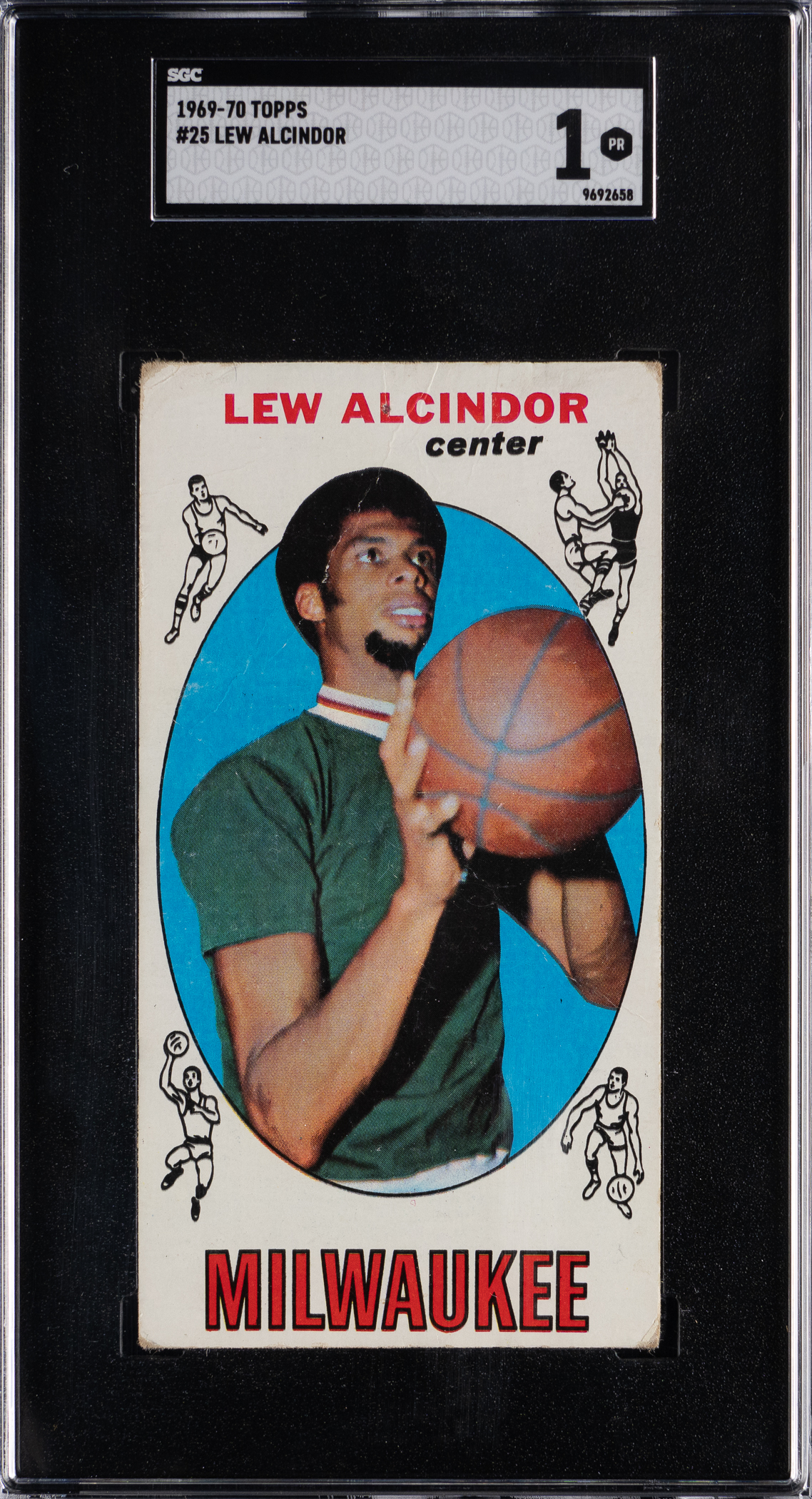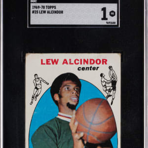 Graded POOR 1 by SGC. The future Kareem Abdul-Jabbar is portrayed on the offered 1969-1970 Topps Basketball #25 Lew Alcindor rookie card. Milwaukee Bucks Hall of Famer.