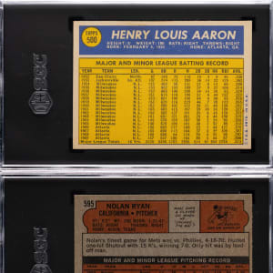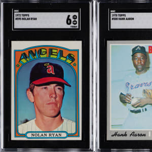 Each graded by SGC. Clean pair of 1970 and 1972 Topps Hall of Fame superstars. Includes: 1.) 1970 Topps #500 Aaron (SGC EX/NM+ 6.5) and 2.) 1972 Topps #595 Ryan (SGC EX/NM 6).