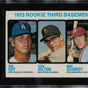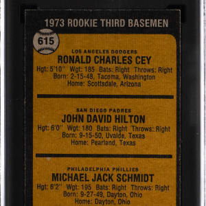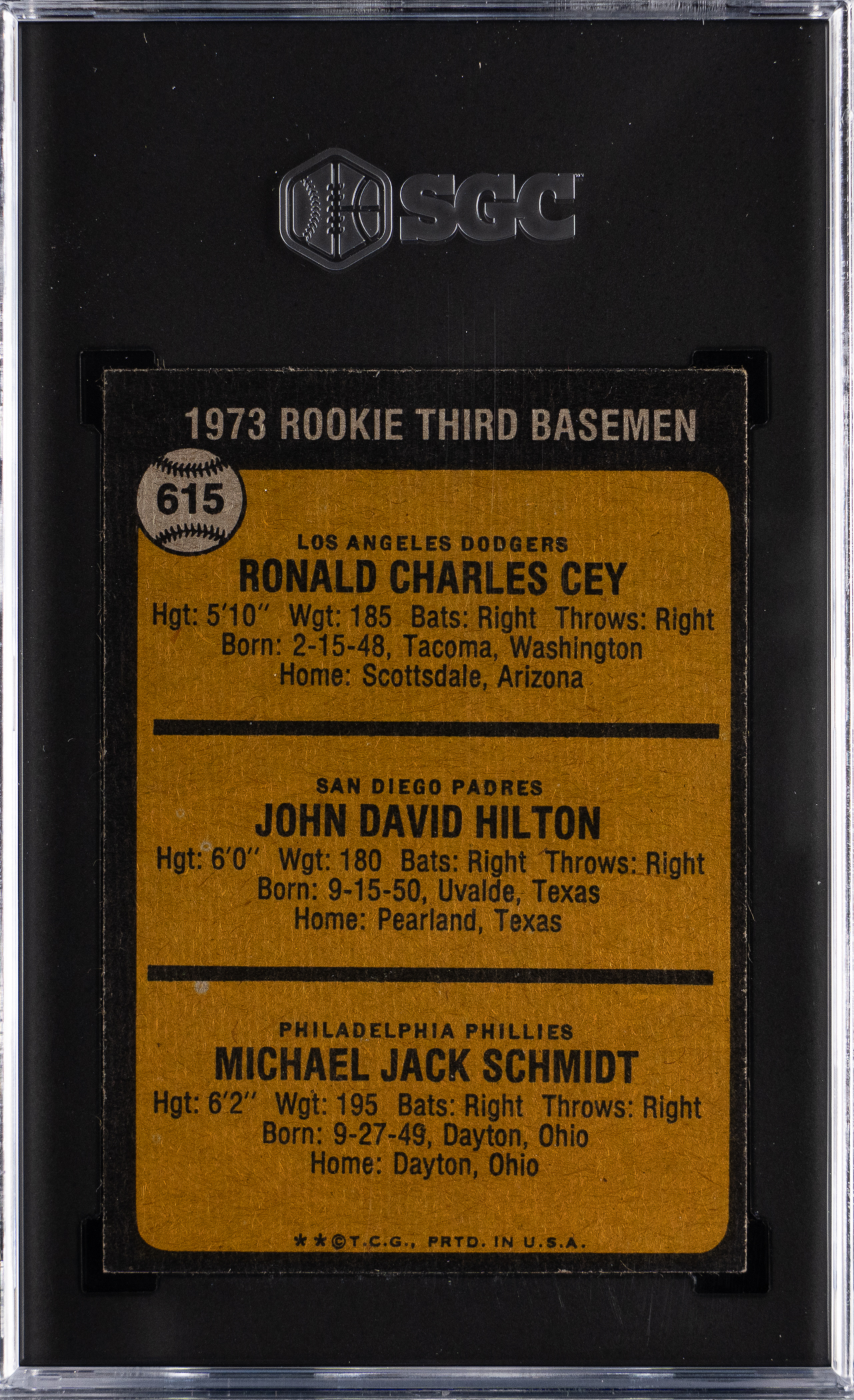 Graded EX/NM 6 by SGC. Philadelphia Phillies Hall of Famer Mike Schmidt (and the capable Ron Cey) is portrayed on the offered 1973 Topps #615 rookie card. High number.