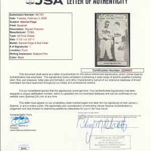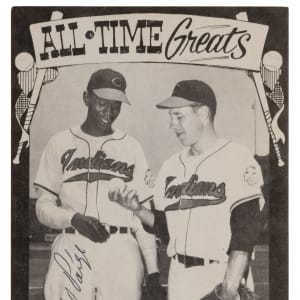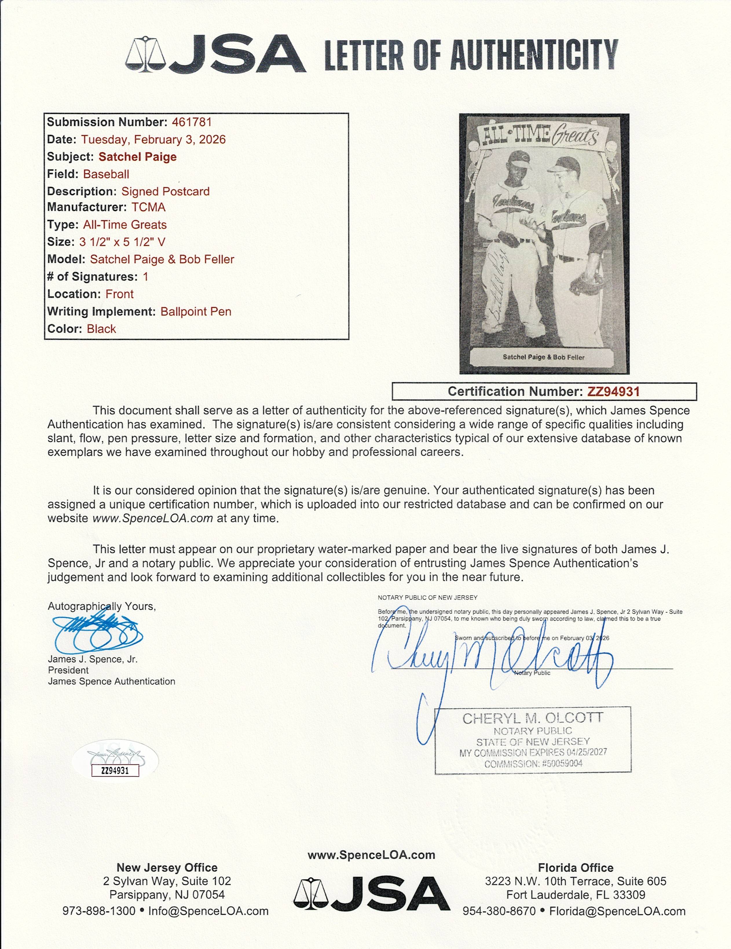 Cleveland Indians Hall of Famers Satchel Paige and Bob Feller exchange pointers on this signed 1973 TCMA All-Time Greats postcard penned by the Negro League legend. The vertical autograph from Paige was penned in the decade between this correspondence piece's release and the hurler's June 1982 death. This (EX-MT) surface is firmly penned in dark ballpoint pen and the overall presentation of this artifact is pleasing. Full LOA from James Spence/JSA.