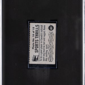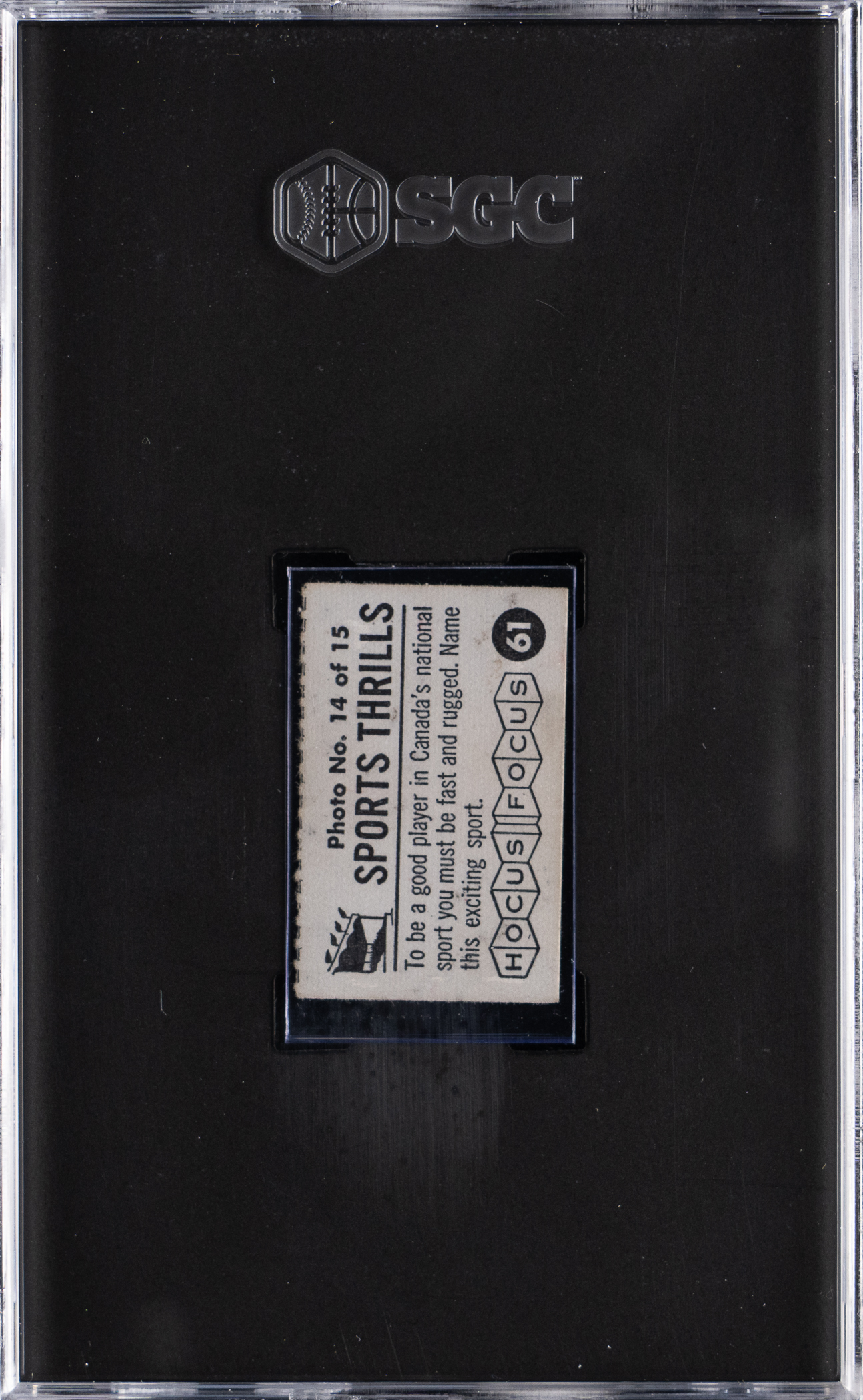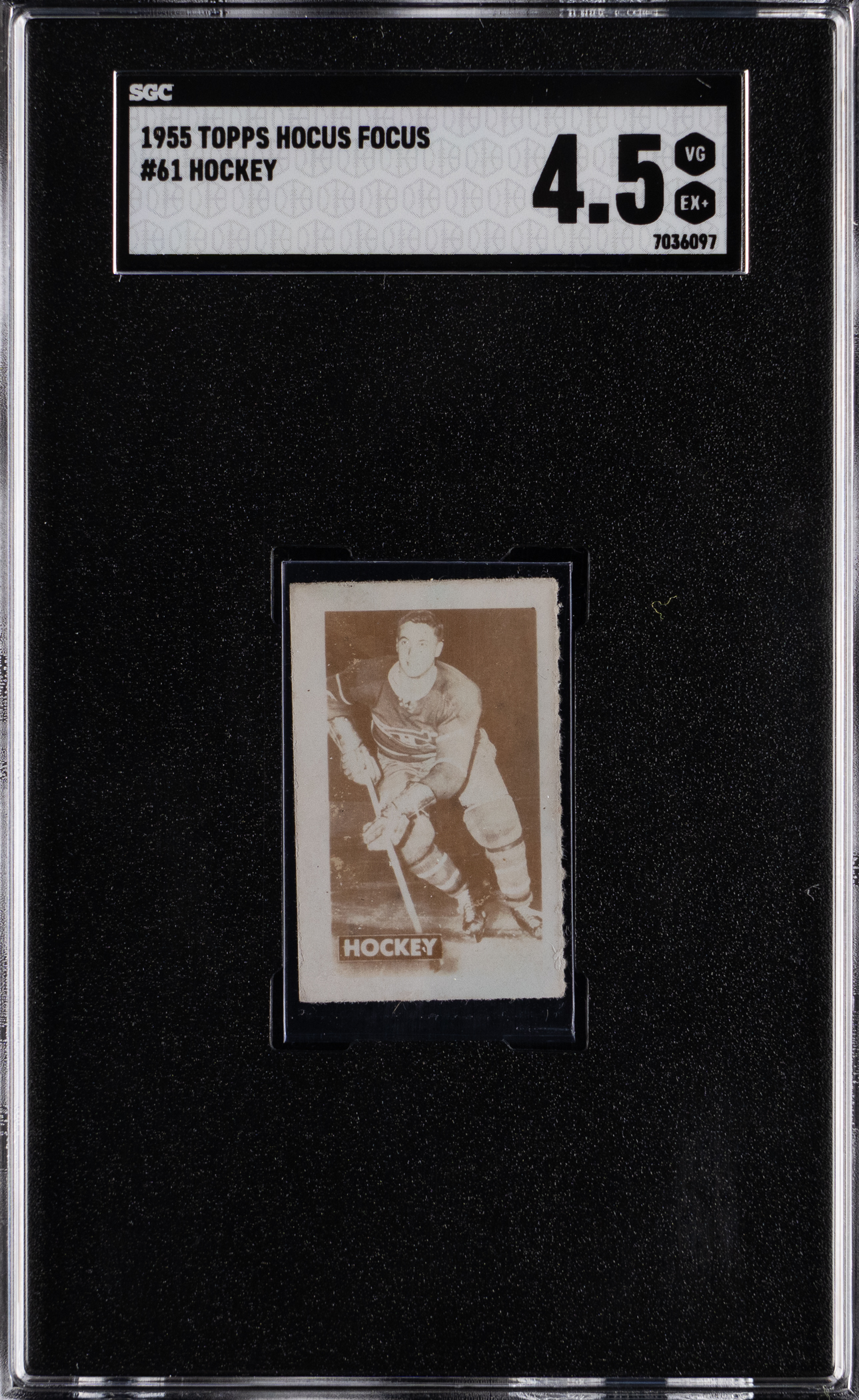 Graded VG/EX+ 4.5 by SGC. One the more difficult hockey cards of the decade belongs to the offered 1955 Topps Hocus Pocus #61 "Hockey" example picturing Montreal Canadiens Hall of Fame great Jean Beliveau. Interestingly, while SGC reports the offered rarity as the lone copy on their grading census, a different SGC graded specimen was publicly sold in 2012. In comparison, PSA has reported just 7 total copies in any condition. What can be confirmed is that this pint-sized treasure with clear player imagery is a seldom offered "must" for vintage hockey oddball specialists!