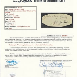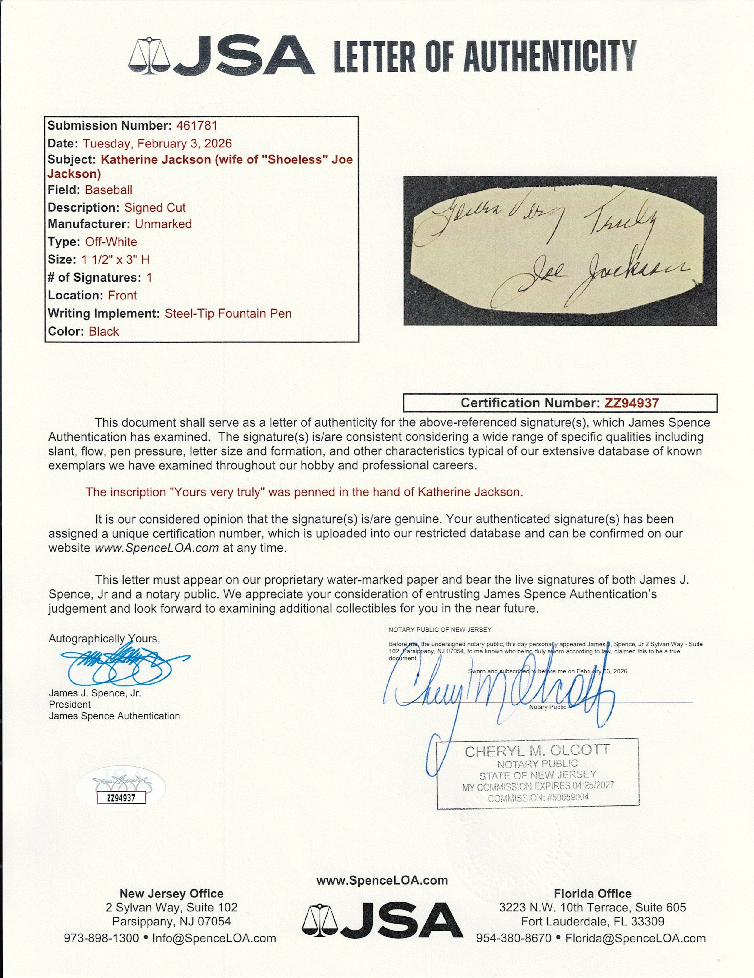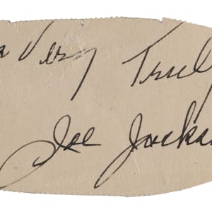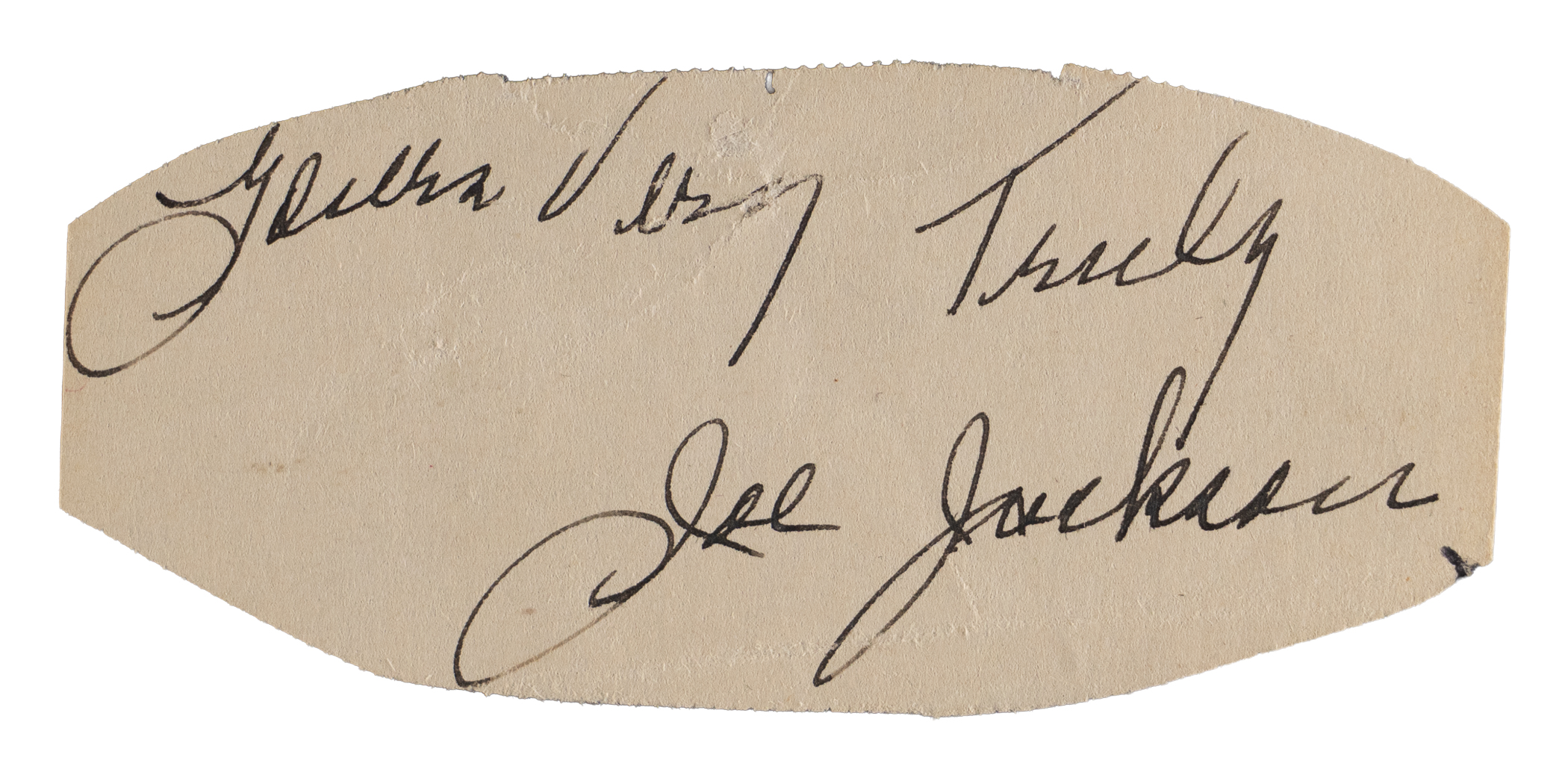 Joe Jackson’s wife Katie stood in for him in authoring this cut signature. While Jackson showed a marvelous array of skills on the baseball field, his writing abilities were far less substantial. It is well-documented that Katie wrote and signed most of Joe’s letters, while also satisfying fan autograph requests. Sized at 3” x 1-1/2”, the offered signature is both neat and distinct. Mrs. Jackson has included the salutation “Yours Very Truly”, suggesting the cut may have be taken from a letter.