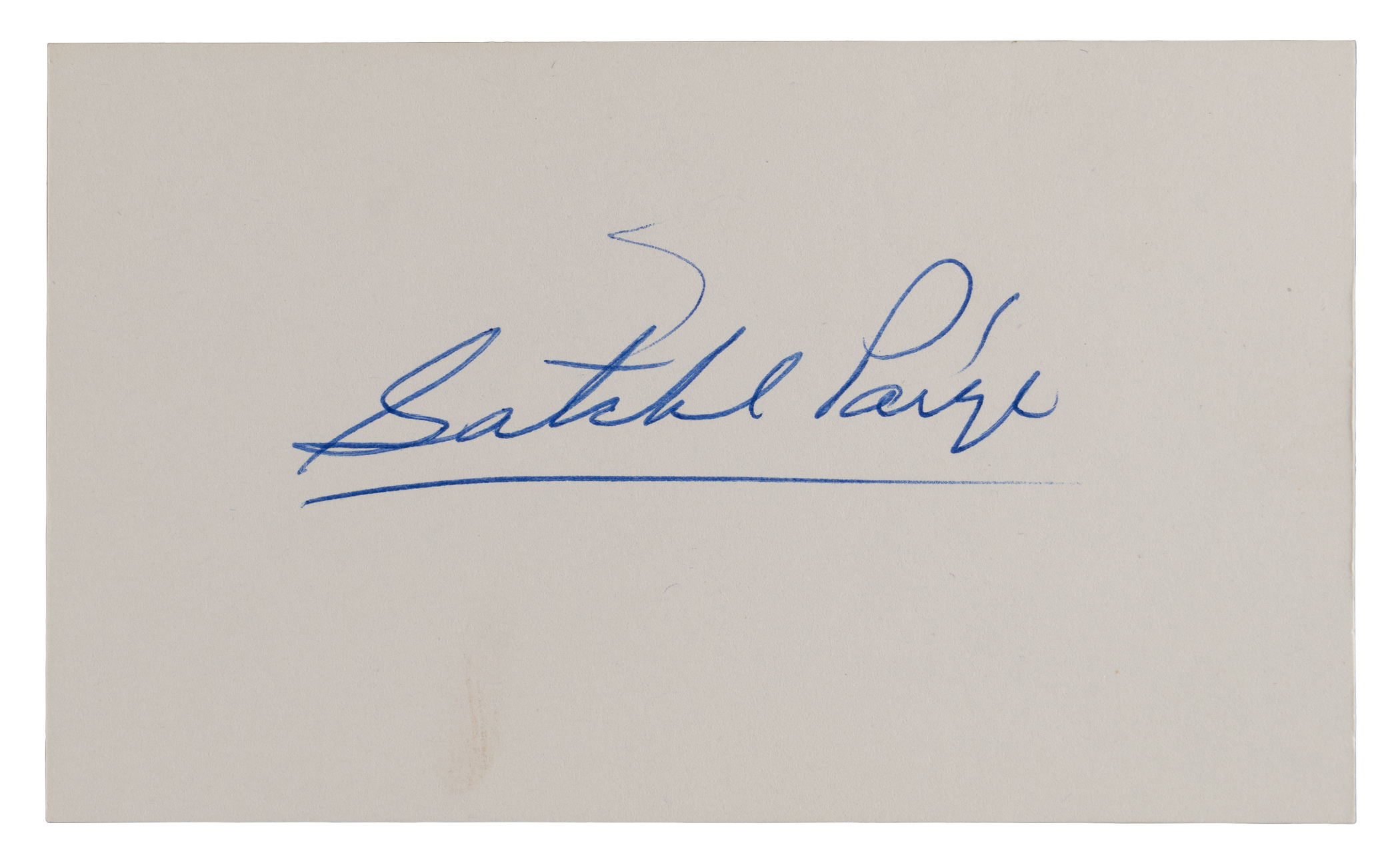 Effectiveness, endurance, guile, a fine sense of humor, and a great feel for showmanship were the traits that made Satchell Paige a Hall of Fame pitcher. Paige (d.1982) demonstrated a talent for penmanship as well, when provided a lucky fan with the crisp signature which he centered nicely on the offered 3x5 index card.