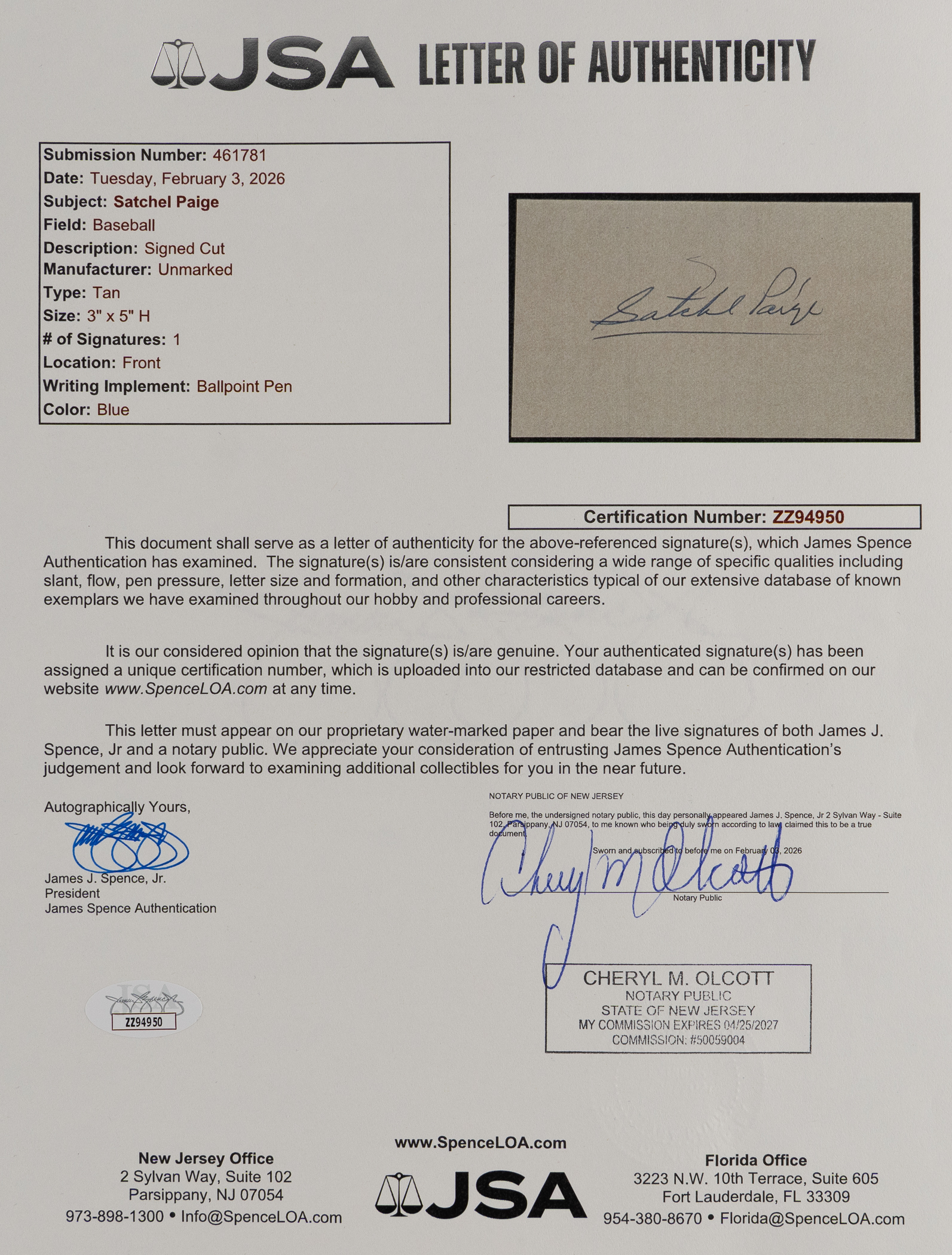 Full LOA from James Spence/JSA.