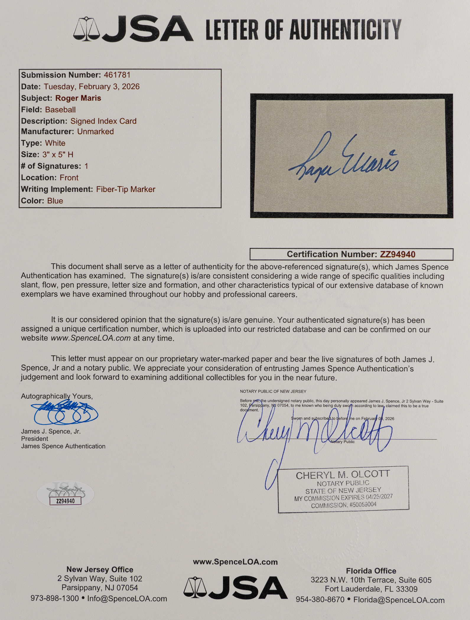Full LOA from James Spence/JSA.