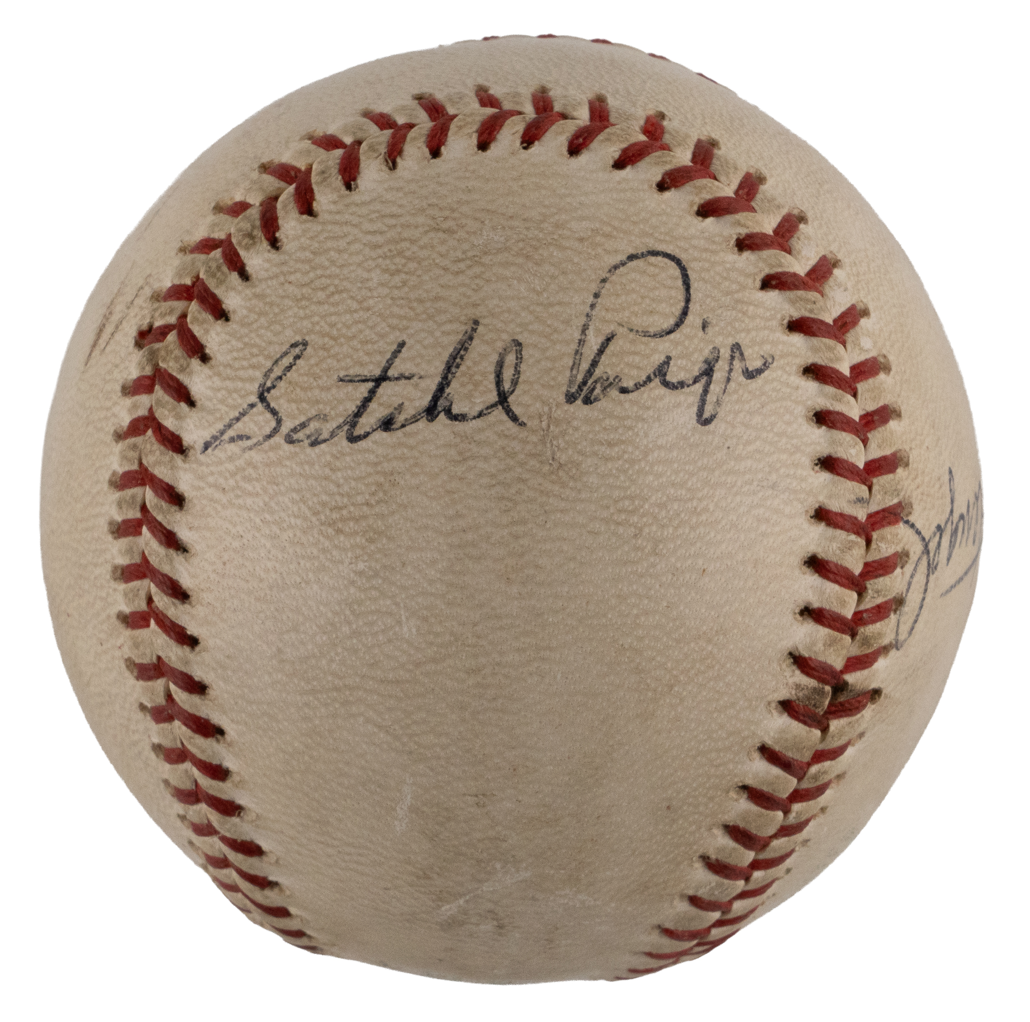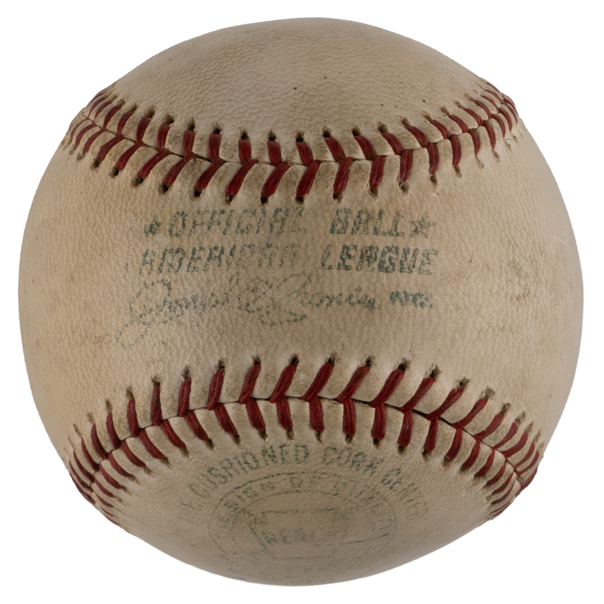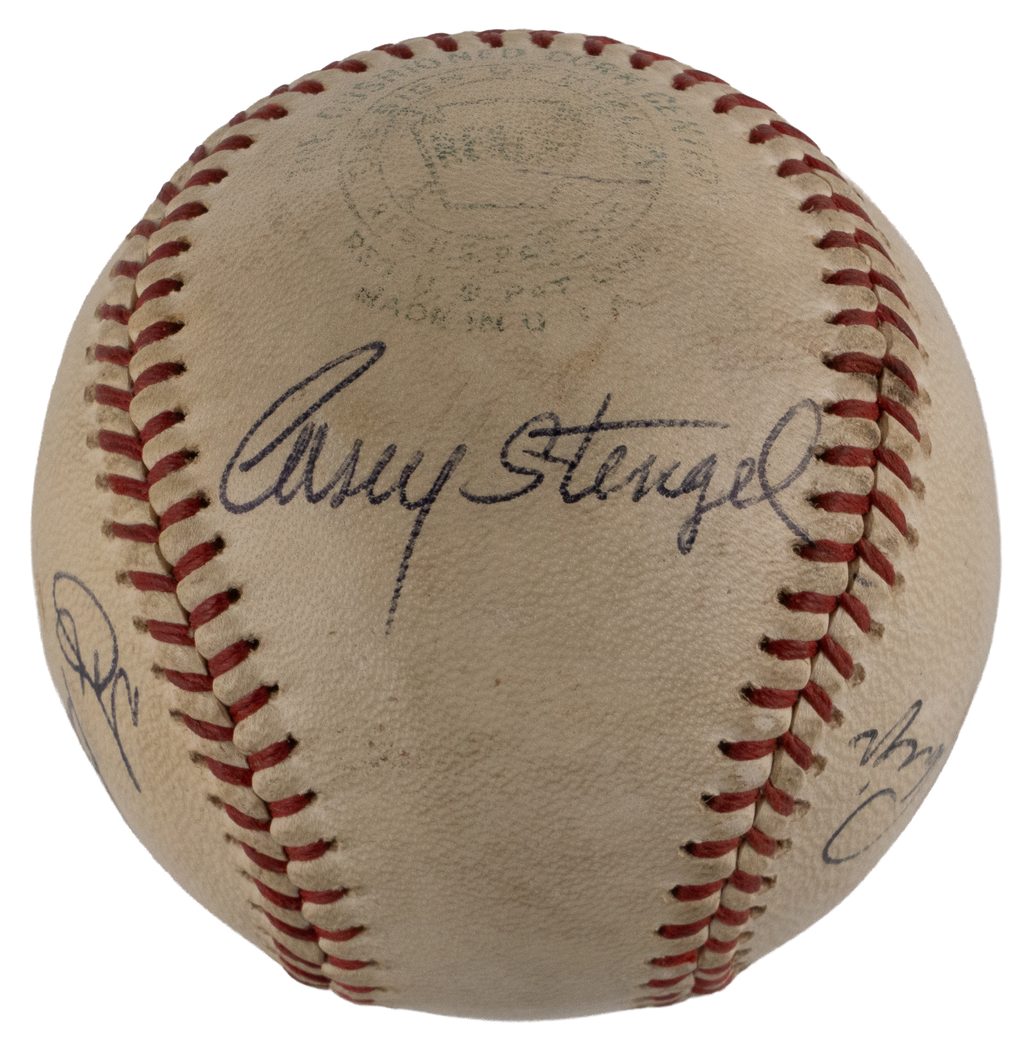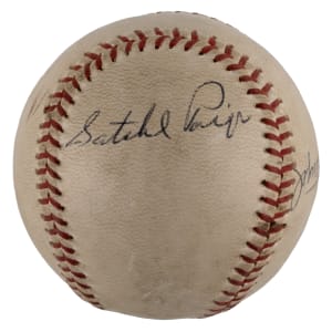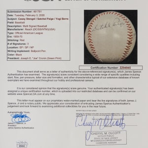 A trio of beloved baseball characters have joined in the signing of this OAL/Cronin baseball. This ball’s faded labeling characteristics are consistent with the period 1960-1969. Each a Hall of Famer, the subjects had what takes to excel on the diamond. They also knew how to work the press, and more importantly, how to amuse fans. These remarkable crowd-pleasing showmen have provided distinct signatures, with “Casey” Stengel (d.1975) on the west panel, Satchel Paige (d.1982) on the north panel, and “Yogi” Berra (d.2015) on the south panel.