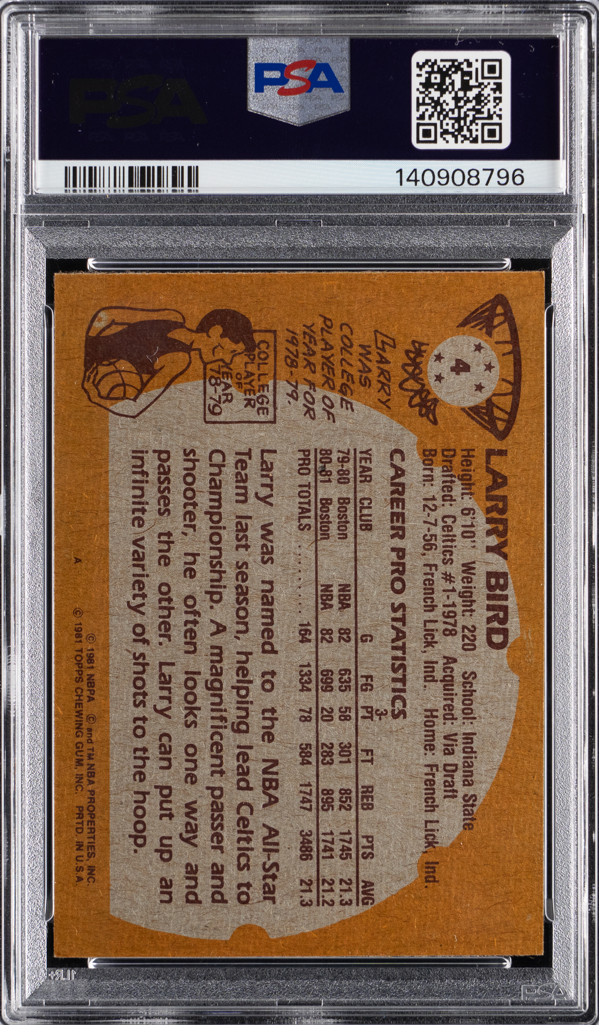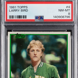 Graded NM-MT 8 by PSA. "Larry Legend" stands alone on a trading card for the first time with this razor-sharp 1981-1982 Topps Basketball #4 second-year example. Boston Celtics Hall of Famer.