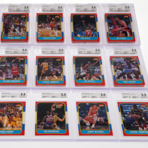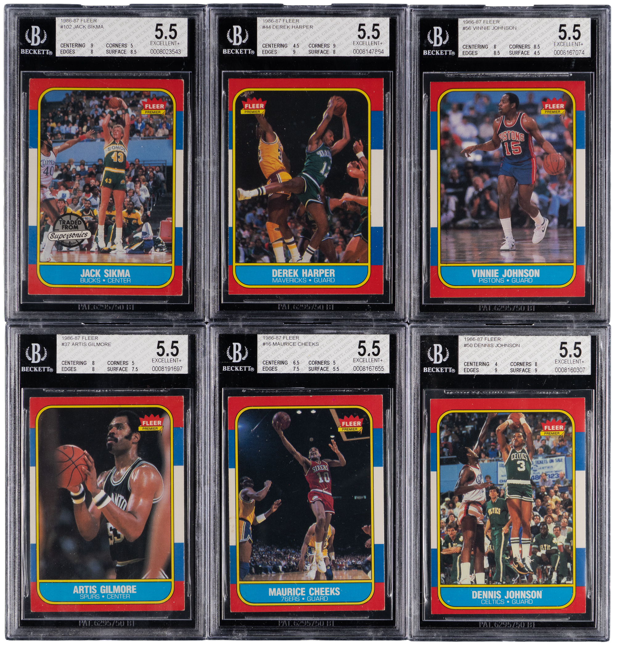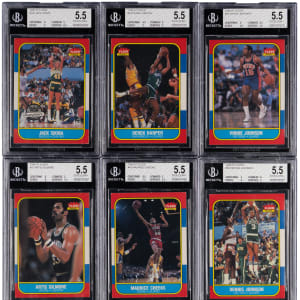 Each graded EX+ 5.5 by BGS. Seize this collection of (36) 1986-1987 Fleer Basketball singles. Includes: #5, 10, 11, #16 Cheeks, 17, 18, 20, 22, 28, 29, 33, #37 Gilmore, 42, #44 Harper RC, #50 D. Johnson, 51, 52, 54, #56 V. Johnson, 63, 65, 66, 71, 74, 85, 95, 101, #102 Sikma, 105, 110, 111, 116, 118, 125, 127 and 130.