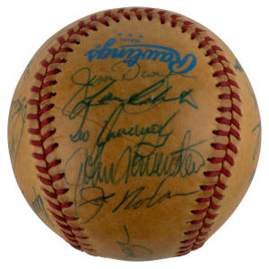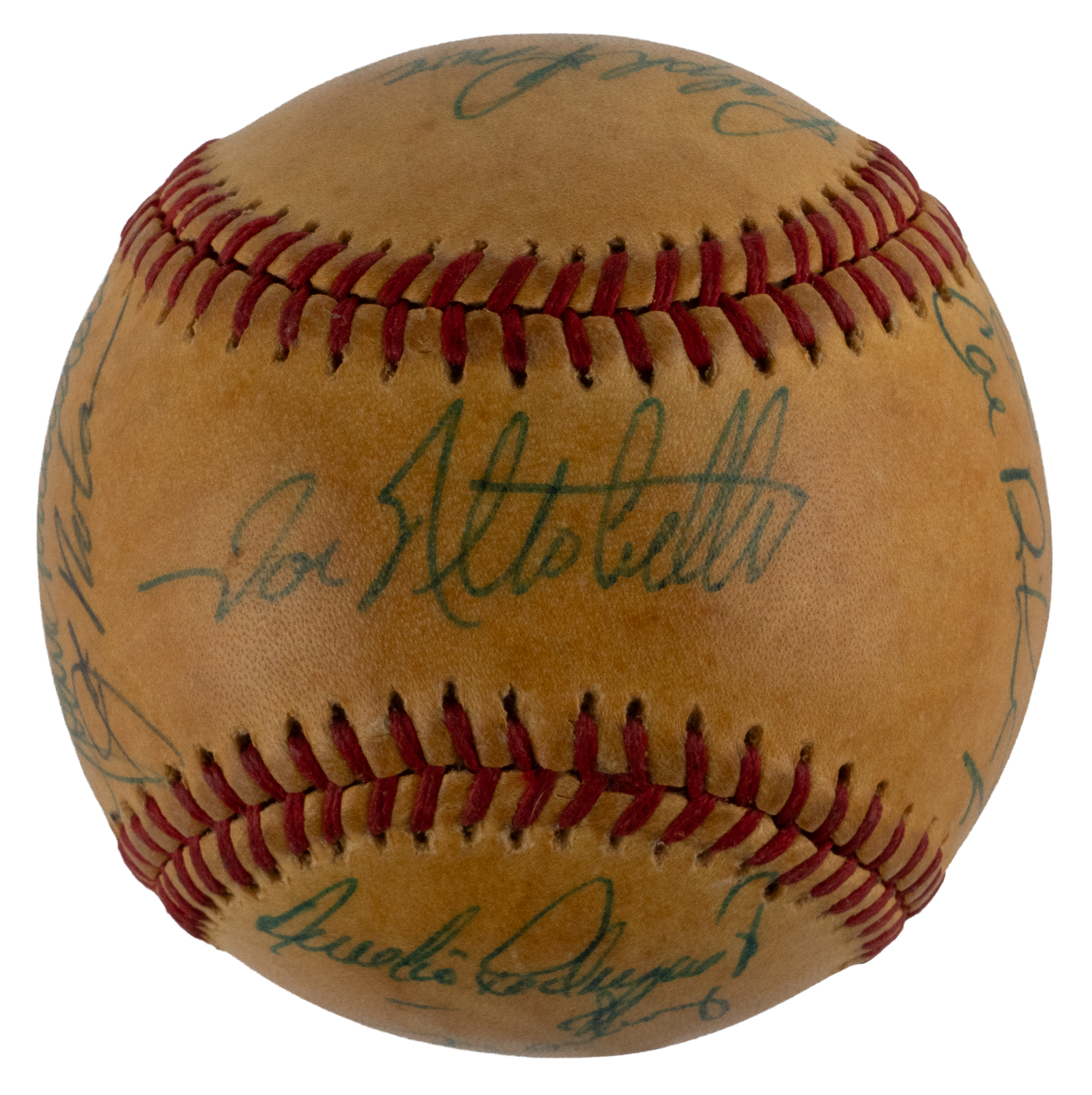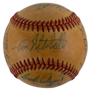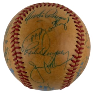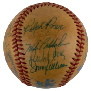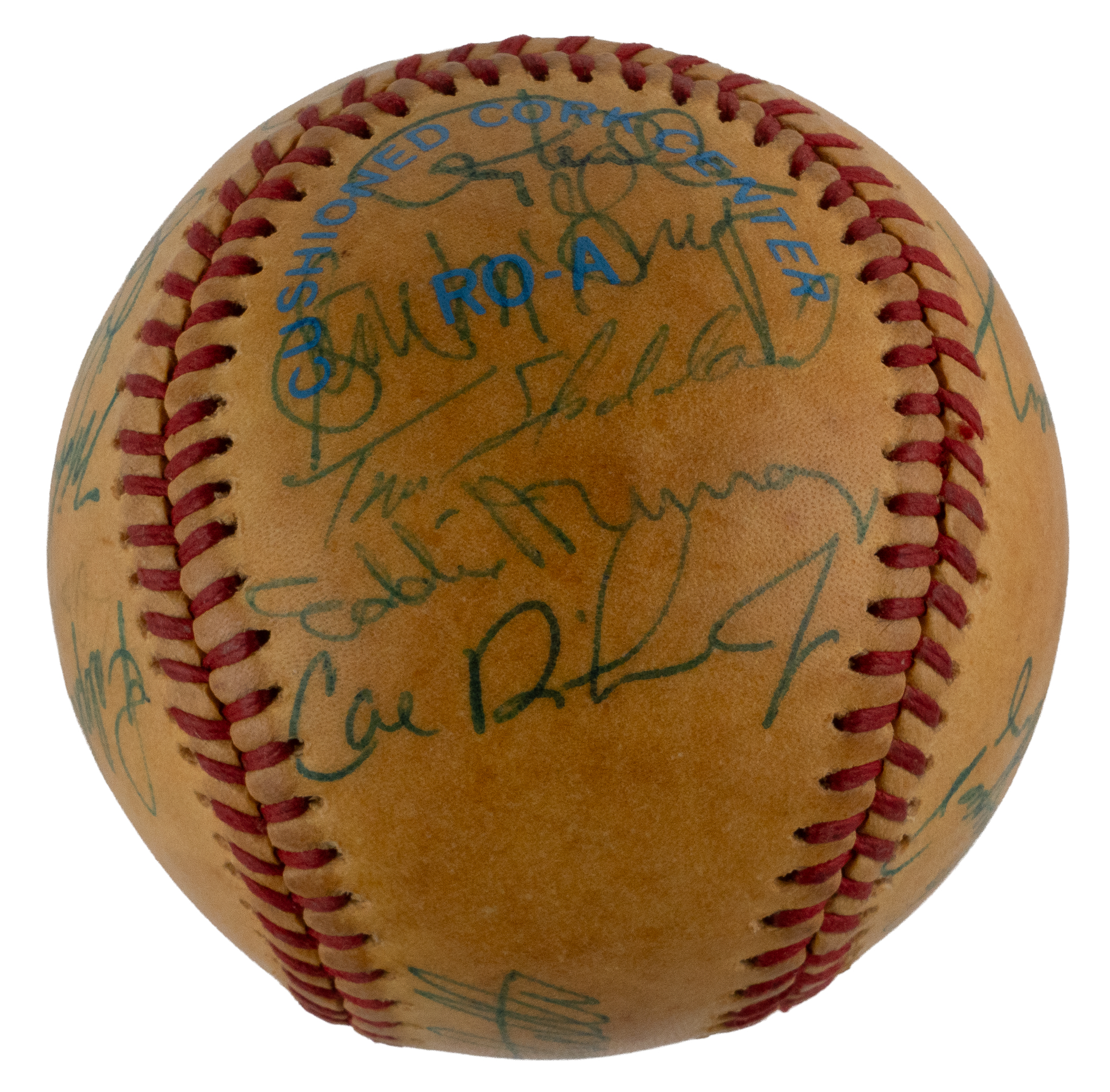 From the last time that Charm City's Birds hoisted a World Series trophy arrives the offered 1983 Baltimore Orioles team-signed ball with (21) signatures. The mostly strong blue ink autographs are preserved by a thin coating of period shellac. Includes: Sweet Spot: Altobelli; West Panel: Dwyer, Sakata, unidentified, Lowenstein Nolan; East Panel: R. Miller, unidentified, Stoddard, Murray, Ripken Jr.; North Panel: Rowe, unidentified, Boddicker, Dauer, J. Williams; South Panel: Au. Rodriguez, T. Martinez, Dempsey, Palmer and Reverse Sweet Spot: Hendricks. Auction LOA from James Spence/JSA.