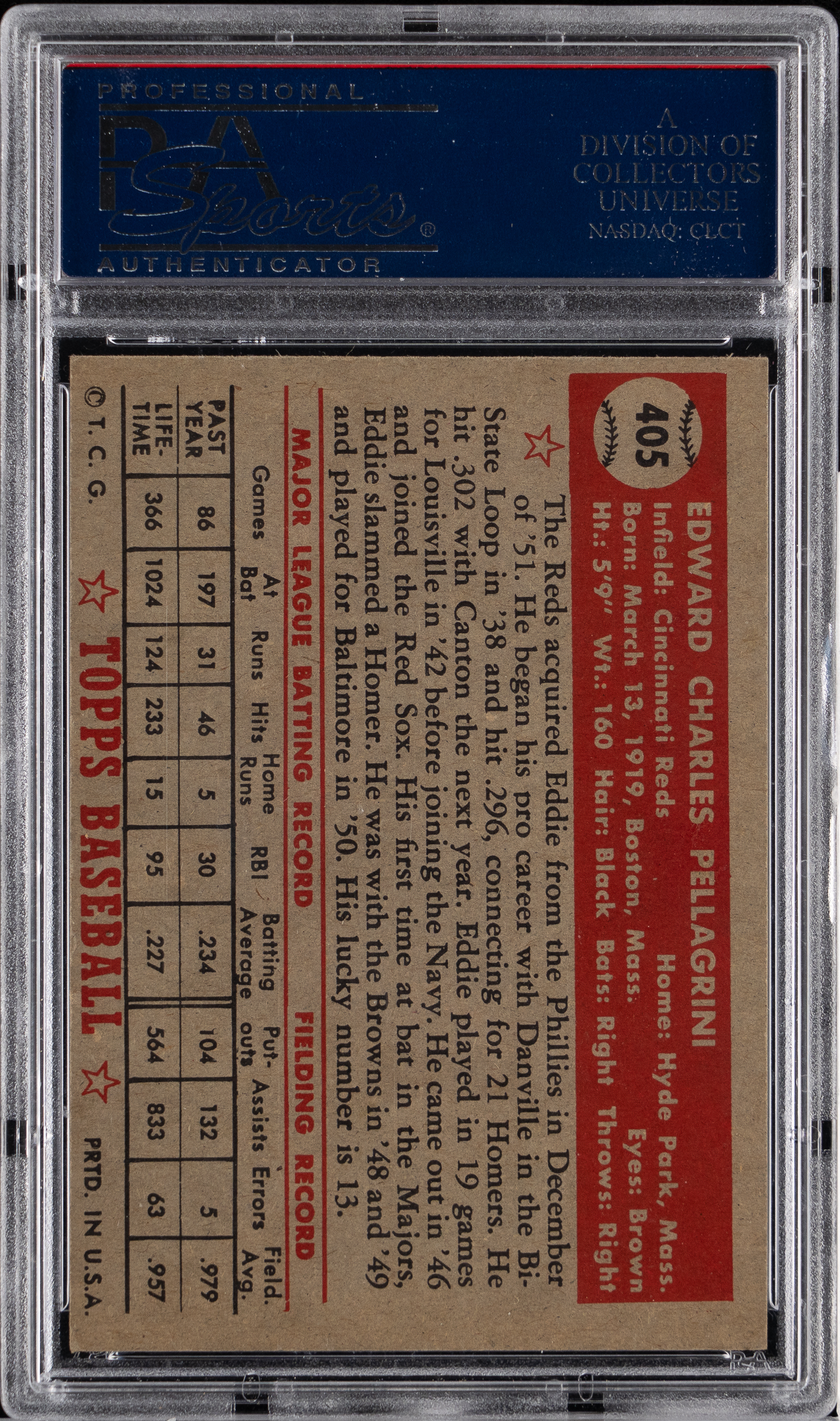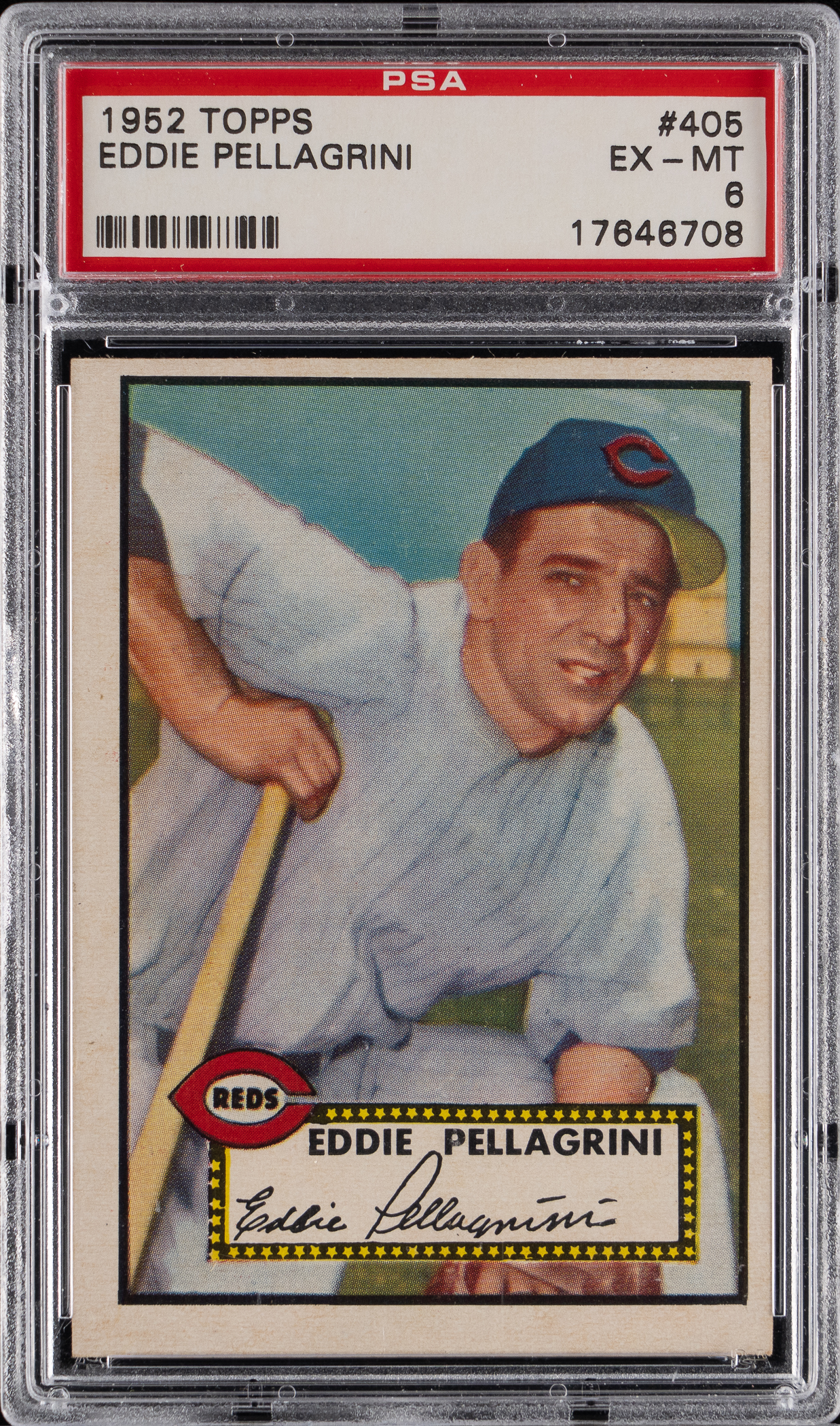 Graded EX-MT 6 by PSA. Cincinnati Reds infielder Eddie Pellagrini. Tough high number.