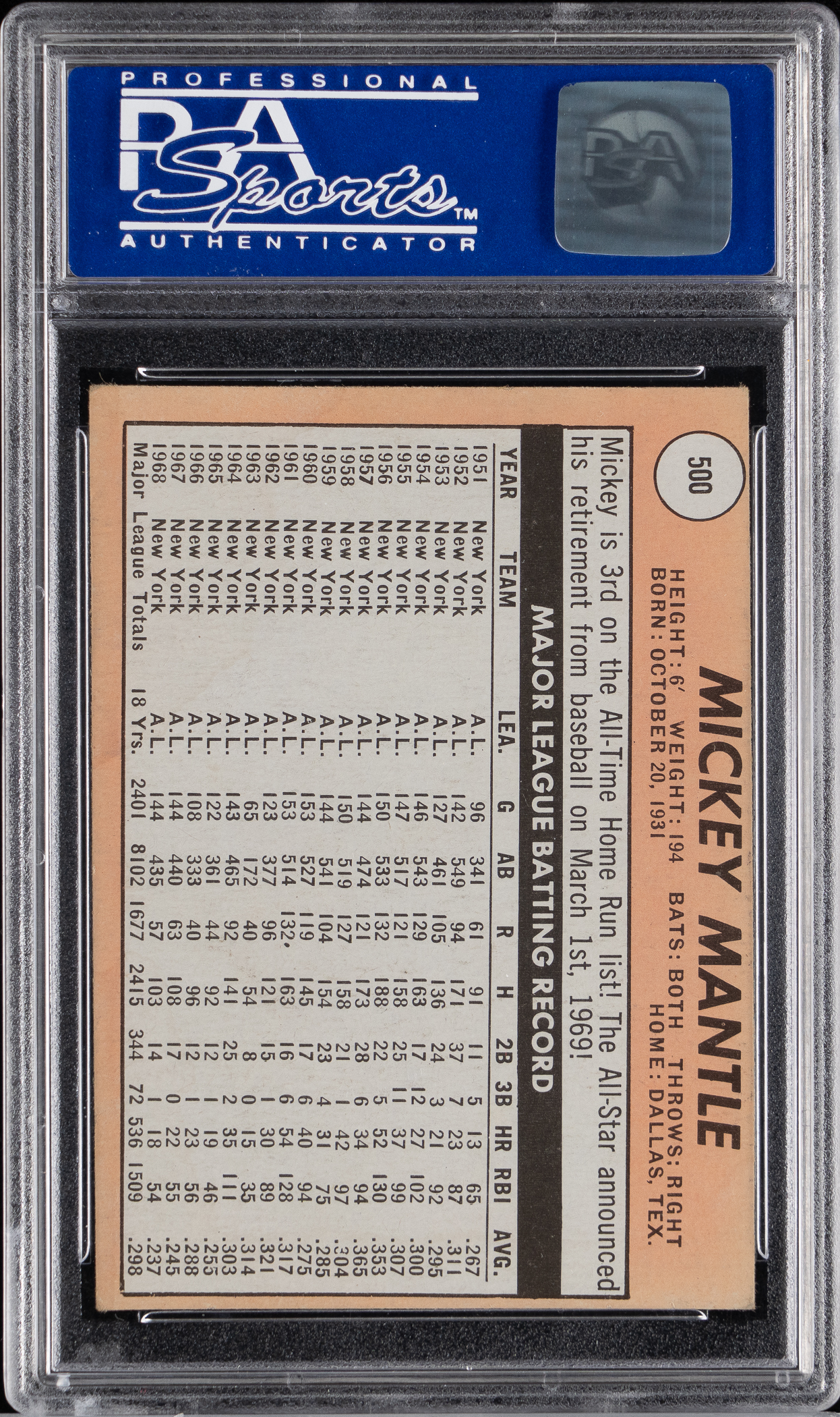 Graded EX-MT 6 by PSA with an (oc) qualifier. Blast off with the offered 1969 Topps #500 Mickey Mantle White Letters variation. This scarce version showcases "The Mick" staring down an opposing pitcher as he bats from the left side of the plate. New York Yankees Hall of Famer.