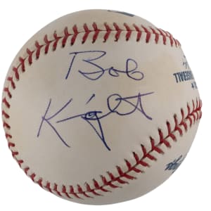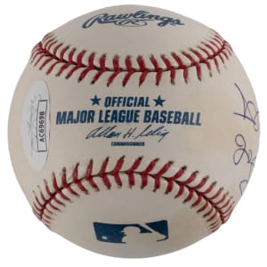 Defined by three NCAA titles, an undying loyalty and a volatile temper, Bobby Knight’s coaching career at the University of Indiana tops the charts as the most controversial in college sports. In a cross-sport conquest, "The General" signed the offered OML/Selig baseball. The blue ink autograph was neatly placed on the north panel of the lightly toned sphere with the signature showcasing ("9") overall strength. JSA authentication sticker and matching cert card.