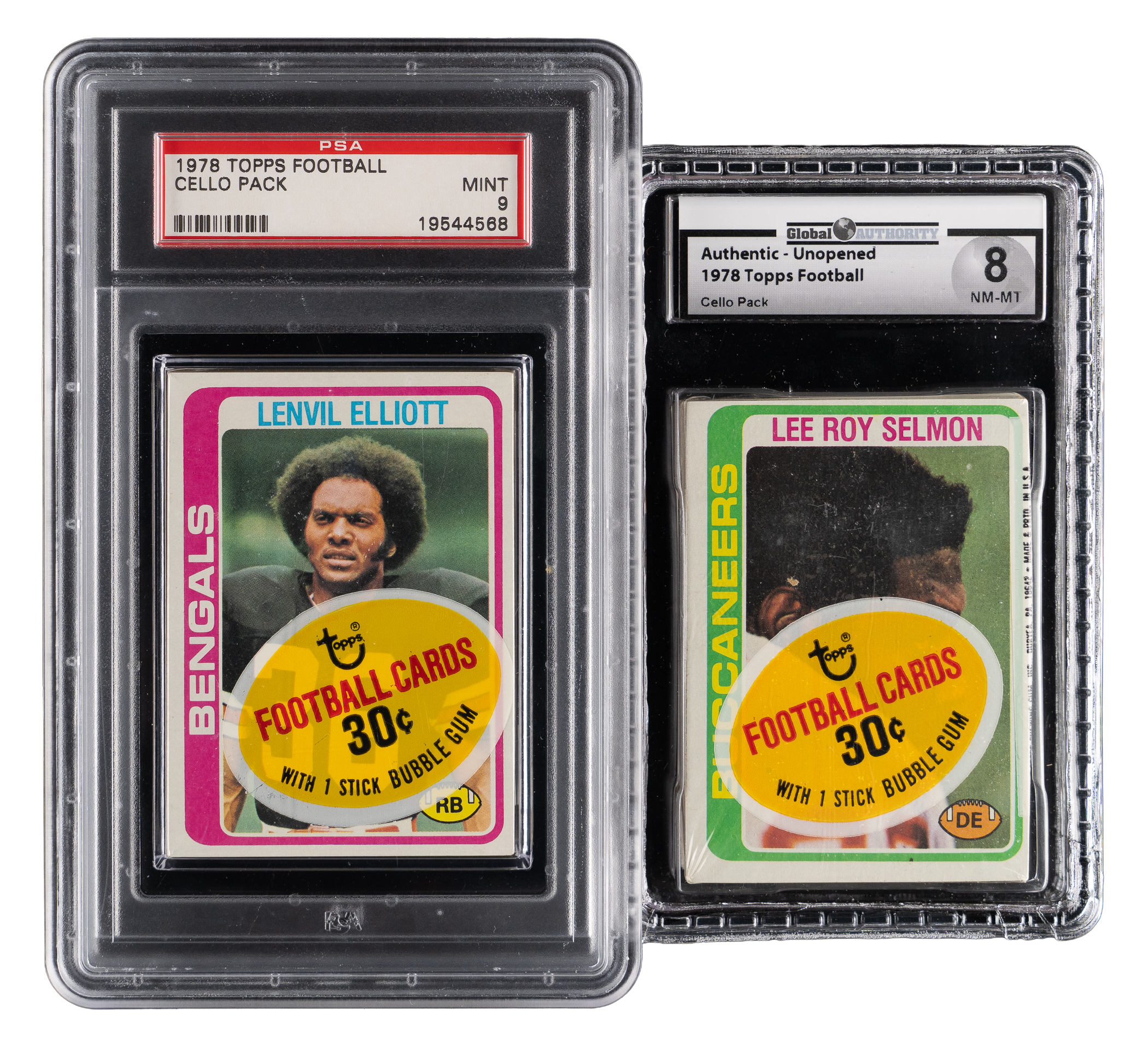 A tantalizing opportunity awaits the victor of the offered pair of graded 1978 Topps Football unopened cello packs. Includes: 1.) unopened cello pack with Lee Roy Selmon showing on front (GAI NM-MT 8) and 2.) unopened cello pack (PSA MINT 9).