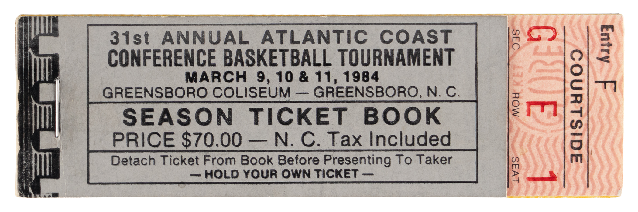 Ticket specialists go all-in for this 1984 ACC Conference Basketball Tournament complete ticket booklet. Found in this unused booklet are (4) complete tickets, with: March 9 Session 1, March 9 Session 2, March 10 Session 3, and March 11 Session 4. With positive connections to a pair of basketball legends, this booklet is filled with gameday souvenirs generating palpable excitment, that's electric. Whether you're one of Michael Jordan’s countless fans, a nostalgic Len Bias devotee, or both, this ticket package is most certainly for you. These dominant stars both participated in the tournament’s first three sessions, and Bias was on the court during the final session. The March 10 semifinals saw North Carolina face Duke, and this contest is recognized as Jordan’s final ACC game. In the March 11 championship game, Maryland prevailed over Duke, and Bias was proclaimed tournament MVP. As far as attrition goes, the tickets show just slight touches of corner wear and are otherwise outstanding. Diligent research failed to discover another complete ticket booklet from this tournament, and the one presented here is potentially the first ever publicly offered.