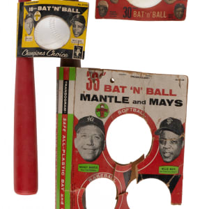 18” Bat ‘N’ Ball set is complete with bat, ball and packaging featuring Mantle and Mays on both sides. The bat and ball are in excellent condition, though the ball is moderately soiled. The Transogram packaging shows a very pleasing degree of integrity.