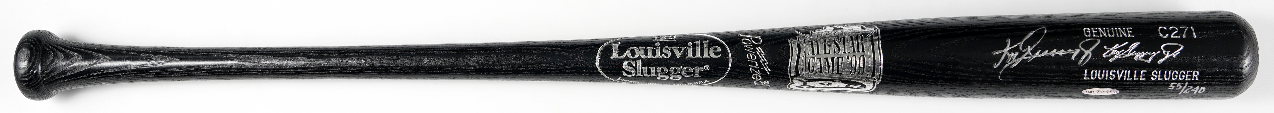 Ken Griffey Jr. has signed this attractive NR-MT black bat with silver sharpie (“8-9”), matching the color of the silver on black of this Louisville Slugger 125 “Boston – All-Star Game ‘99” Ken Griffey Jr. model C271 black bat. The silver signature and the stamped signature are next to each other. Underneath is a notation in silver “55/240” and nearby is the Upper Deck Authentic hologram.