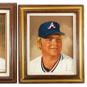 Atlanta Braves All-Stars are glorified in art, with these (2) 1982-1983 Tommy McDonald Enterprises framed portraits. An NFL Hall of Famer, Tommy McDonald owned and operated an art studio during his post-playing career. Though the artwork was performed by staff members, McDonald signed the paintings himself, in name of his art company. A heavy-hitting slugger for the Braves, Horner belted 32 homers in 1982 and was named an NL All-Star that season. Braves teammate Benedict made the NL All-Star squad in 1981, largely for his defensive skills. He was named an NL All-Star a second time in 1983, when he batted a career high .298. Both Braves All-Stars are reverently rendered in oil on board, in these captivating portraits. The Horner piece is framed to overall dimensions of 15-1/2” x 18-1/2”, and the Benedict piece is framed to overall dimensions of 16” x 19”. These vintage portraits present handsomely, with vibrant colors, though the Horner piece bears a fairly unobtrusive dotted streak of foreign matter near the bottom-right corner. McDonald has signed both pieces in identical fashion, as “T. McDonald”.