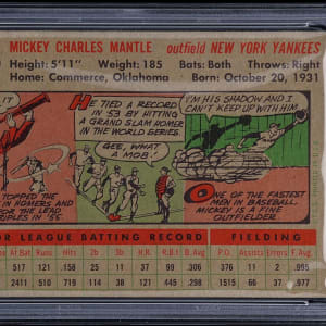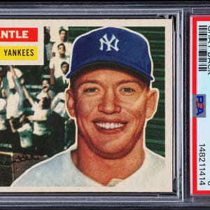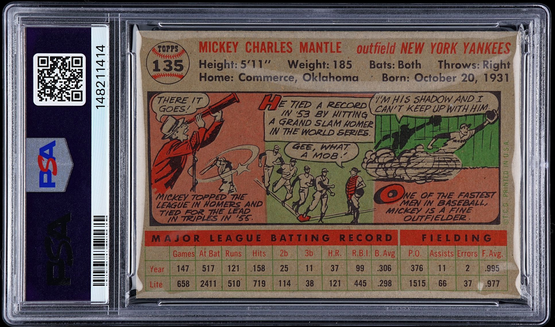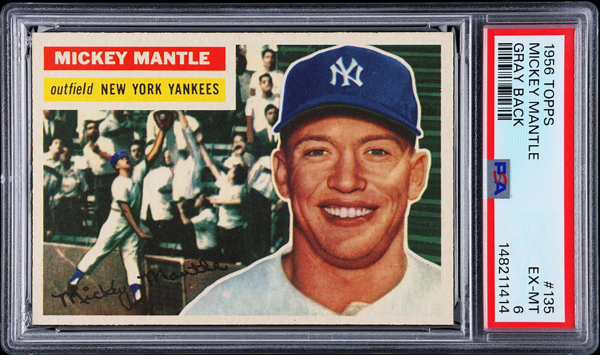 Cornerstone '56! Graded EX-MT 6 by PSA. Exceptional 1956 Topps #135 Mickey Mantle (gray back) variation that presents at the absolute pinnacle of its overall evaluation. This recently graded version of the Triple Crown Winner pictures the multi-talented New York Yankees Hall of Famer leaping into the stands to rob an opposing batter. A precisely centered beauty of #7 which displays razor-sharp corners, creamy factory edges, and spellbinding surface colors with gorgeous dual action/portrait pose accents. The reverse detailing Mantle's postseason exploits is sparkling clean. An investment quality "Mick" that is quite possibly the sweetest "6" in the hobby!