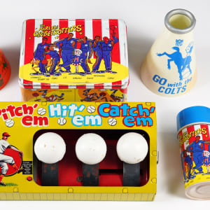 (2) Plastic Megaphones with Metal Neck Chains. One with Bucking Baltimore Colts logo and “GO WITH THE COLTS” and the other has logos from every NFL team and “GO WITH THE PROS.” Both are approximately 7” long and are in Very Good to Excellent condition.