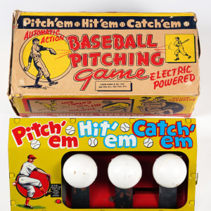Circa 1958 Louis Marx and Co. Automatic Action Baseball Pitching Game. 5 x 6 x 12 ½ box still houses this battery-operated metal machine that pitched 3 plastic balls in six second intervals when you turned it on, which you could then catch or hit. The machine is in Excellent condition, while the box is Good to Very Good with one end not attached.