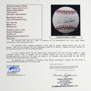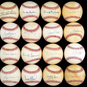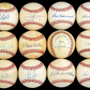 One with full LOA from James Spence/JSA: Rich Ashburn; Fifty with individual JSA basic cert/sticker: “Pee Wee” Reese, Nolan Ryan, Ernie Banks, Phil Niekro, Carl Yastrzemski, Brooks Robinson, “Whitey” Ford, Earl Weaver, Reggie Jackson, Willie McCovey, Hal Newhouser, Rod Carew, Hoyt Wilhelm, Johnny Bench, Harmon Killebrew, Greg Maddux, Gaylord Perry, Steve Carlton, “Duke” Snider, Bobby Doerr, Eddie Mathews, Joe Sewell, Monte Irvin, Stan Musial, Robin Roberts, Frank Robinson, Enos Slaughter, Bob Feller, Billy Williams (2) with one generic ball, Al Barlick, Robin Yount, Johnny Mize, Rollie Fingers, Billy Herman, “Sparky” Anderson, John Smoltz, Carlton Fisk, Charlie Gehringer, Lou Brock, Tony Gwynn, Fergie Jenkins, “Buck” Leonard, George Kell, Eddie Murray, Warren Spahn, Ralph Kiner on the south panel, Early Wynn, Bob Lemon, Tony LaRussa; One with JSA sticker only: Bob Lemon; Twowith auction LOA from JSA: Frank Thomas, Andre Dawson; Four with individual PSA/DNA basic cert/sticker: Don Sutton, Larry Doby, Luke Appling, Minnie Minoso; Two with PSA/DNA sticker only: Al Kaline, Rickey Henderson.