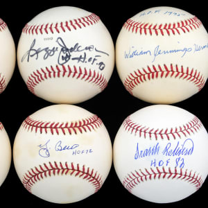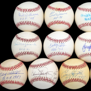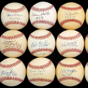 Hall of Fame members announce the year of their induction, with this single-signed baseball collection (28). Unless noted, the obliging subjects have provided average (“8” to “9”) strength signatures, on the sweet spots of ONL, OAL, or OML baseballs. Each Hall of Famer has accompanied his prized signature, with an inscription of his induction year.