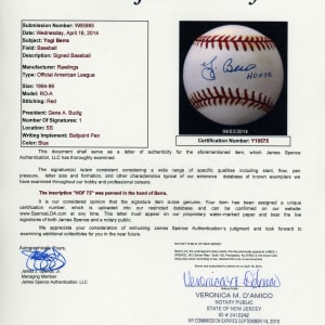 “Yogi” Berra with “HOF 72”, full LOA from James Spence/JSA;