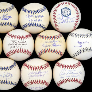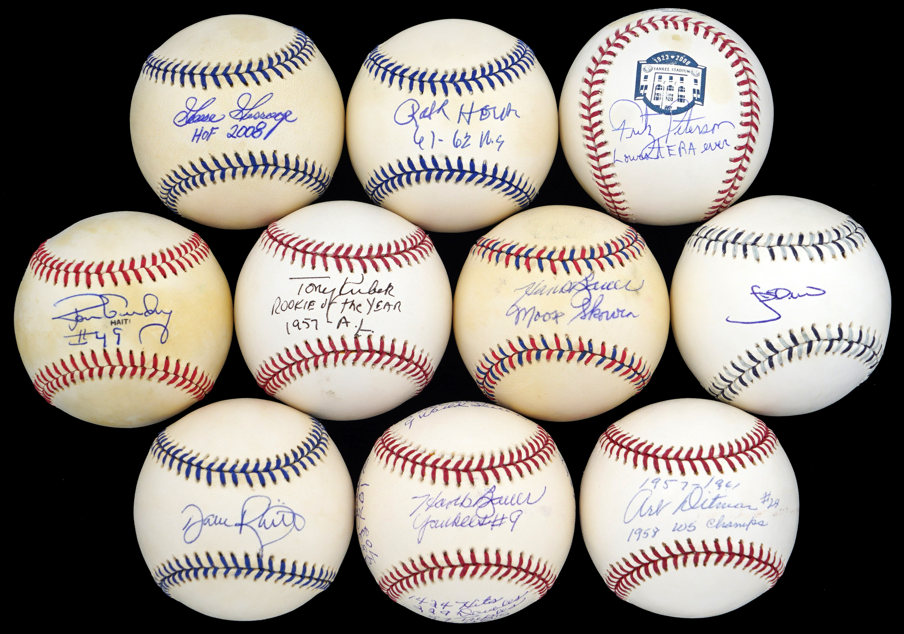 Love them, or hate them, you have to recognize the New York Yankees as baseball's greatest dynasty. Star players who contributed to the Yankees greatness are assembled, with this collection of (10) signed commemorative baseballs. Adorned with inscriptions and/or specialized logos, these baseballs are clean and attractive, with solid signatures across the board. Each of these signed baseballs comes with an individual JSA cert/sticker, unless noted otherwise.