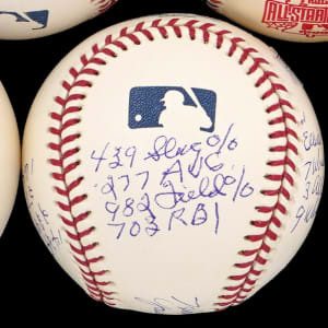 Hank Bauer with an extensive array of inscriptions as follows "Yankees #9, Ellie's NY Friend, 7 World Champs, 3 All Stars, 9 World Series, 1424 Hits, 229 Doubles, 57 Triples, 164 HR's, 1544 Games, 5145 AB. 833 Runs, 2259 Bases, 439 Slug %, 277 Avg, 982 Field %, 703 RBI", on an OML/Selig ball;