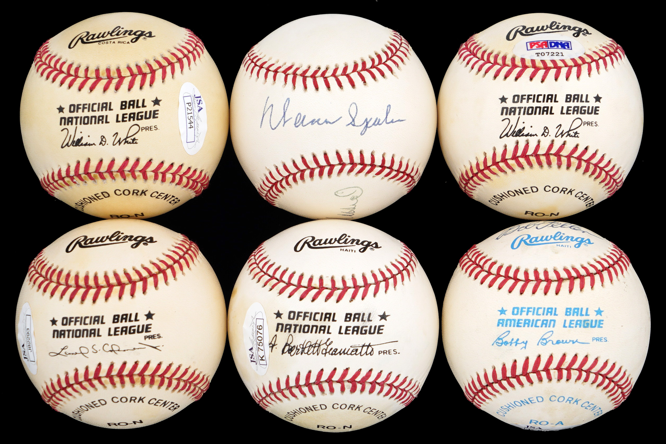 Ralph Kiner, Early Wynn and Bob Feller triple-signed OAL/Brown ball, JSA cert/sticker;