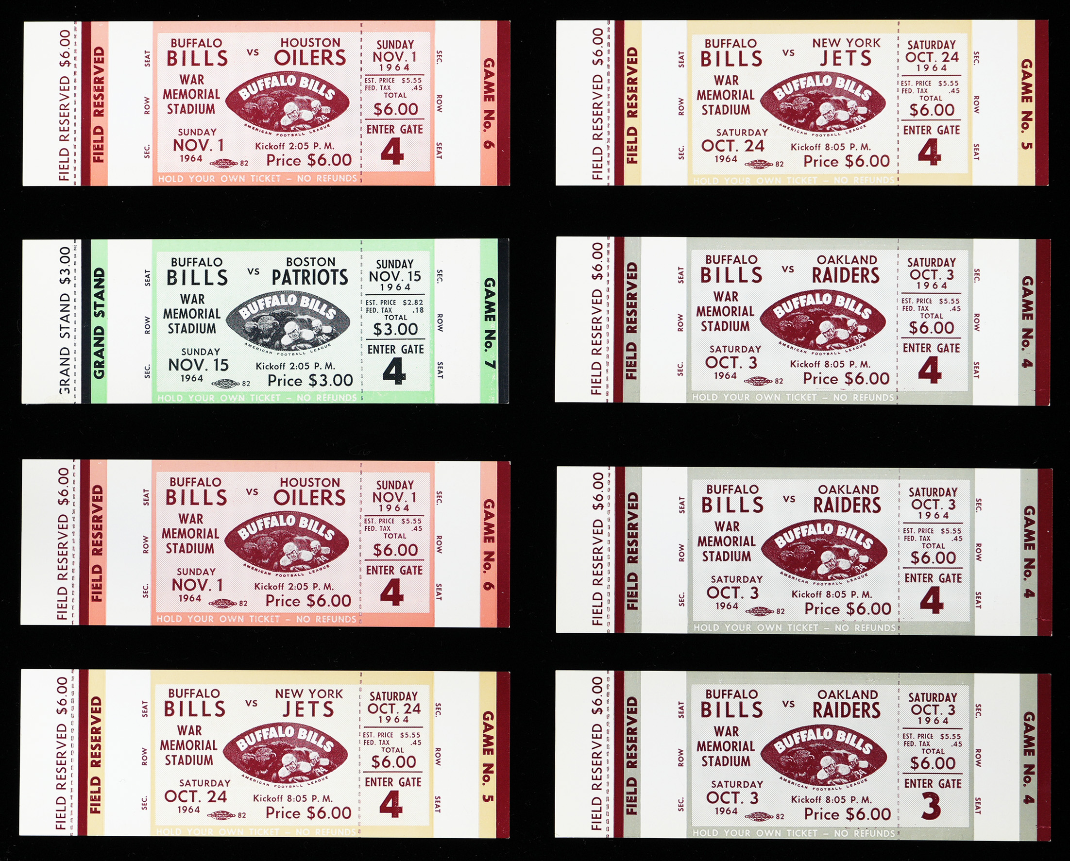 Score scarce unused AFL gameday souvenirs, with this 1964 Buffalo Bills full ticket collection (19). Despite some valiant efforts in the early 1990s, and the 2020s, the Bills have yet to win a Super Bowl, though they did reign supreme over the AFL in the mid-1960s. Old-timers and historians will recall, that in their fifth season of play, the Bills stampeded across the upstart league, to win their first of back-to-back AFL championships. AFL ticket stubs are notoriously tough to find in better grades. Full tickets are exponentially tougher, and this outstanding group stacks up as a magnificent find, thanks to so many sharp examples. Held by the original owner since the year of issue, these gorgeous full tickets average (EX to NM) condition, unless noted. The right edges are finished with solid color bars, causing the corners at that end to be condition sensitive. Otherwise, these unused tickets would rate higher, as they present straight off the printing press quality, with clean surfaces, bold colors, and distinct graphics.
