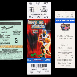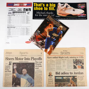 Revisit Michael Jordan’s last hurrah, with this April 16, 2003 final NBA game collection (8). A crowd of 21,257 fans got to bid “His Airness” goodbye, when he suited up for the last game of his glorious career, to face the Philadelphia 76ers at the First Union Center. This assembly of tickets, publications and other related items revolve around Jordan’s historic farewell.